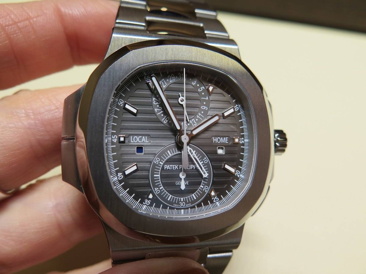 The second of Patek Philippe’s two introductions this year is the Nautilus Travel Time Chronograph Ref. 5990.  It has two hour hands on the same axis. The lower one is skeletonized, and the upper one matches the style of the minute hand. The skeleton hand displays home time while the solid hour hand indicates local time. The hour hand for local time can be adjusted in one-hour steps with the plus and minus correctors on the left case side. If, by mistake, the wearer pushes both forward and back buttons at the same time, the watch automatically defaults to forward. It contains Caliber CH 28-520 C FUS.