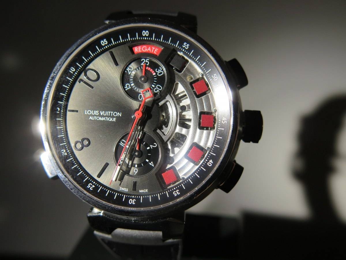 Louis Vuitton Tambour Spin Time Regatta Titanium, a visual regatta timer with a five-minute countdown timer (the new America’s Cup rules dictate a five-minute start). The movement, Caliber LV156 was made by La Fabrique du Temps, and is also a chronograph. The five-minute countdown is indicated on the dial by five rotating cubes. The watch is unique in that the three dials work together to time two races and then track the difference between the two times.