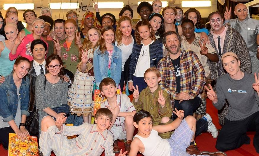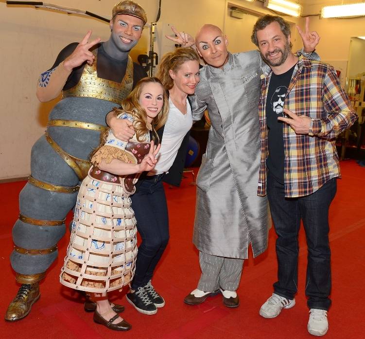 “This is 40” star Leslie Mann, together with husband, writer and producer Judd Apatow, celebrated her birthday at the early performance of The Beatles LOVE by Cirque du Soleil at the Mirage on Monday. The couple was joined by two young aspiring actresses, their daughters, Maude and Iris Apatow, and friends. Leslie and Judd sipped on red wine during the show, while the young ladies enjoyed water and soda. The group came backstage and greeted the cast and crew of LOVE with applause, autographs and hugs. This was third time the Apatow family came to see LOVE and promised to return soon.