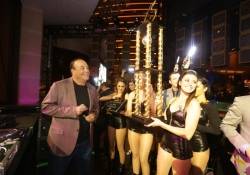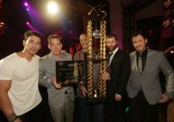 XS’ executive director of nightlife marketing Ronn Nicolli cut the music and took over the mic as he called Taffer on stage. As confetti rained down on a shocked Taffer, the XS executive staff led the cocktail servers with their light wands waving in the air to the stage. Once the procession was complete, Jesse Waits, Nicolli, John Wood and Yannick Mugnier presented Jon with a gold trophy and a Lifetime Achievement Award. The plaque honors Jon’s career, which has been devoted to leadership in the hospitality industry, providing vision and guidance to nightclub and bar owners across the country. The five friends talked about the convention while posing for photos and enjoyed the night together.