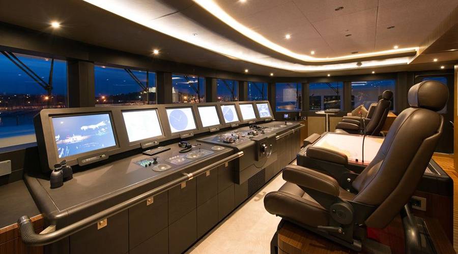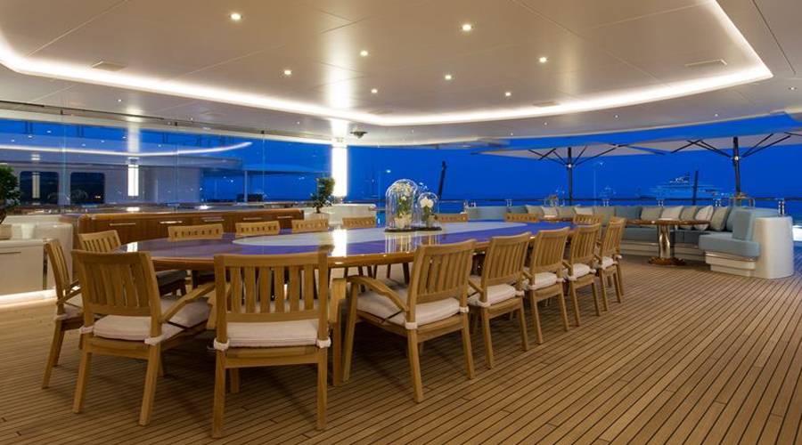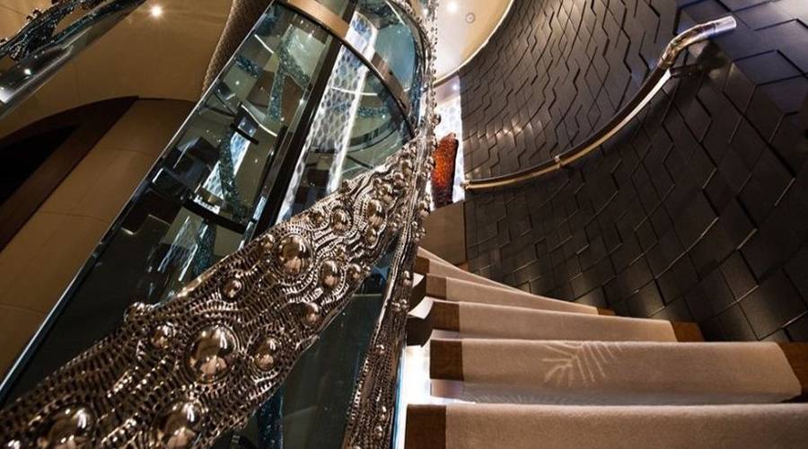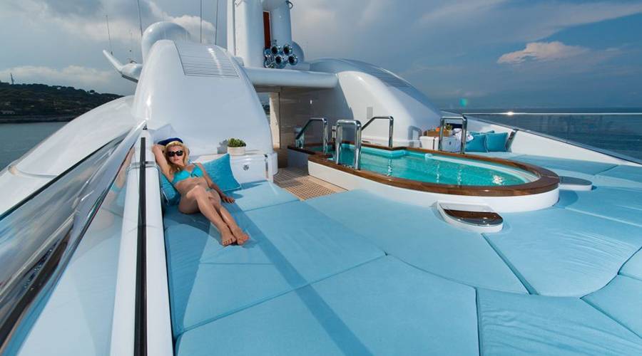 The Nirvana’s six decks are accessible via a silver engraved elevator. The exterior features a stunning swimming pool lined with chaise lounges, two helipads, eight jet skis and a dozen diving kits, among other water sports equipment. For a different type of entertainment, the Nirvana offers a 3D movie theatre inside and a stage for live performances outside.