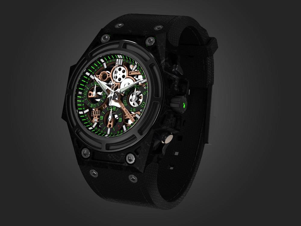 This 44mm x 46mm x 15mm timepiece timepiece features a forged carbon case with a black ceramic bezel and a titanium crown with DLC coating. The openworked 3D dial features hours and minutes, a central chronograph hand, and sub-dials for hours, minutes and seconds. Only 99 numbered pieces of the SpidoSpeed Green will be produced, and it will retail for CHF 21,000 (approximately US$23,704).