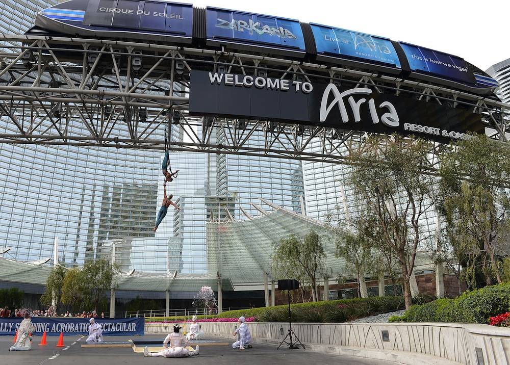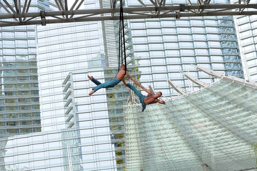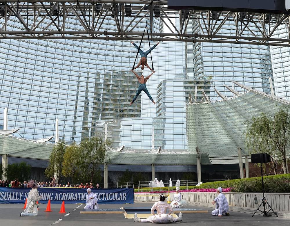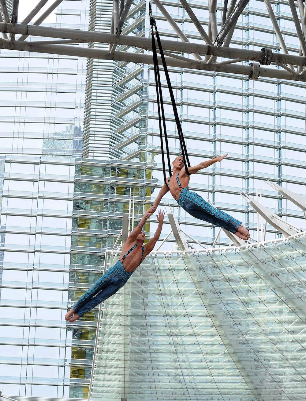 Aerialists Andrew and Kevin Atherton thrilled spectators as they performed outside Aria’s porte cochere, while suspended 32 feet in the air.