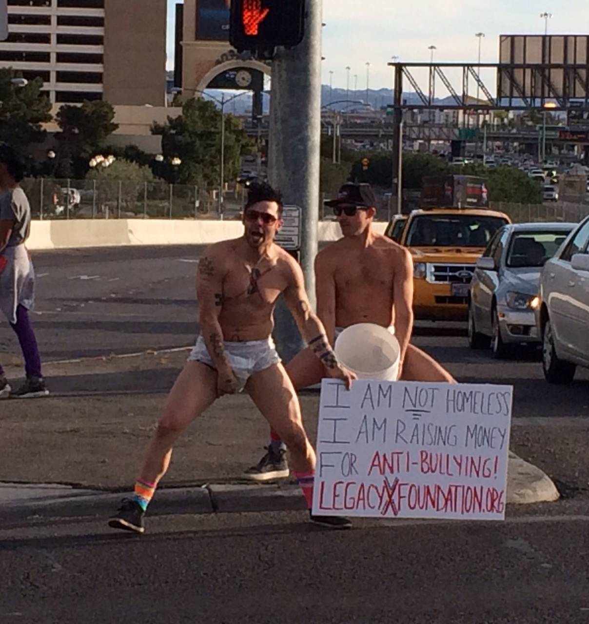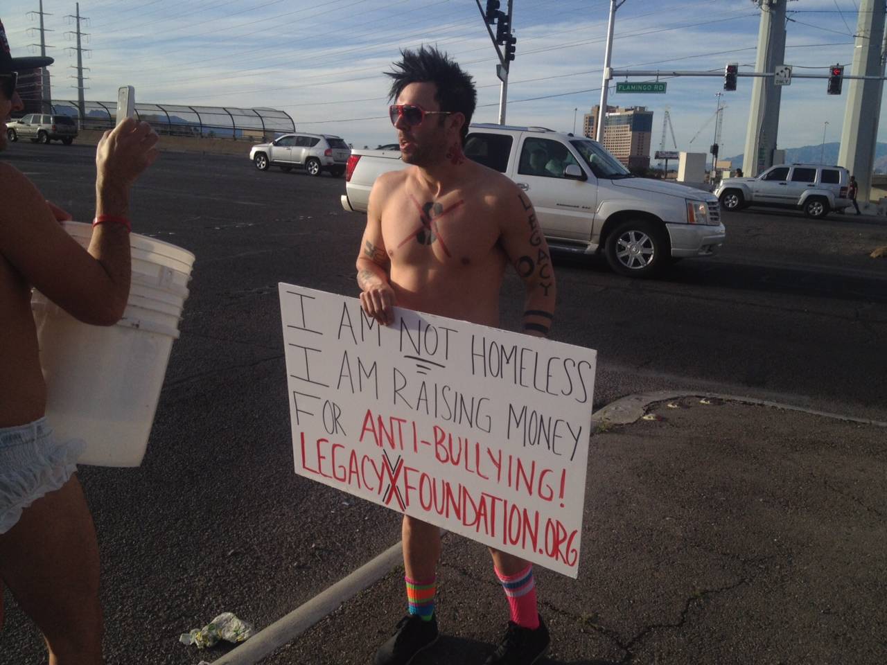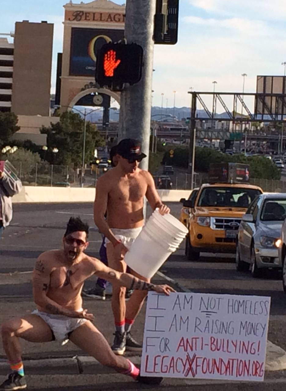 Legacy X and Recycled Percussion founder Justin Spencer took to the streets of Las Vegas to raise money and awareness for the national event Bully X. Never one to disappoint with how far he is willing to go to end bullying, Spencer not only hit one of the busiest intersections off the I-15 (Flamingo exit going North), but also wore nothing but an adult diaper, sign and a smile. Unfortunately, Las Vegas’ finest put a stop to the fun(draising) within 10 minutes.