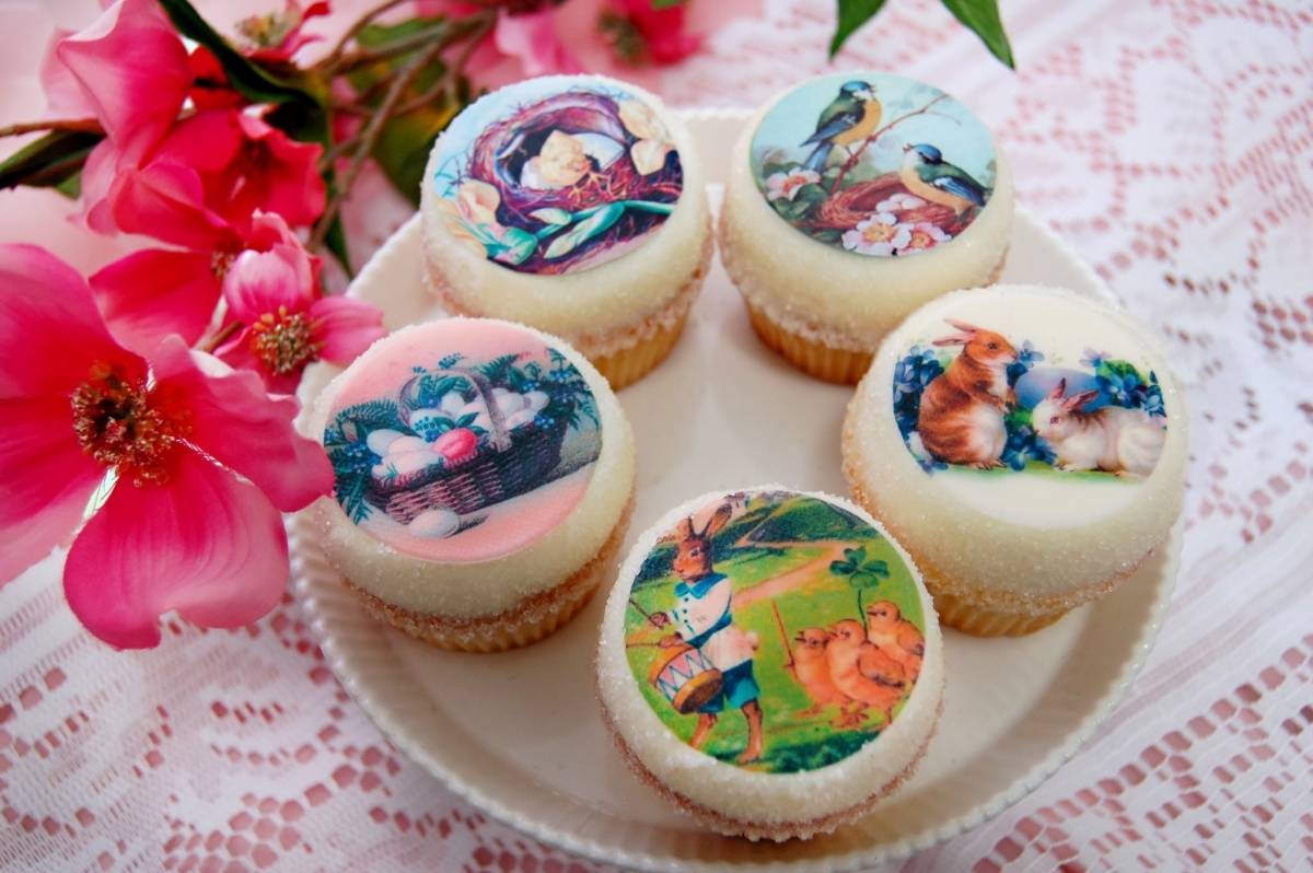 Easter themed edible images decorate these classic chocolate and vanilla cupcakes with vanilla buttercream.