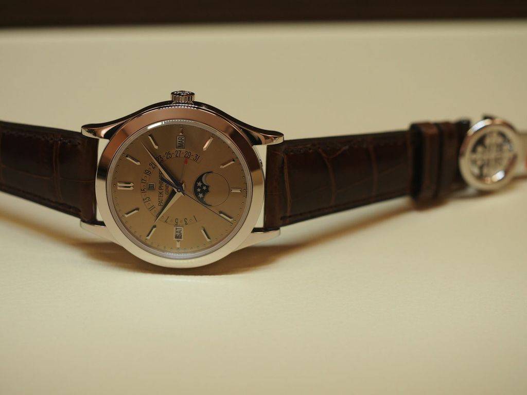 The honey brown dial in contrast with the platinum case gives the new Grand Complications Ref. 5496P-014 a unique look. This perpetual calendar timepiece features hours, minutes and seconds, as well as a sweep seconds hand, a retrograde date hand, a moon phase indicator, and day, month, leap year apertures.