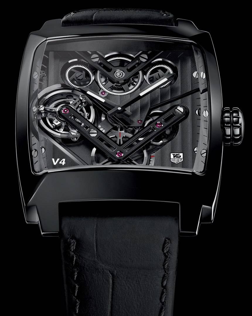 Housed in a 41mm x 41mm case of space-grade black titanium, this timepiece features an openworked dial with hours and minutes, as well as small seconds on the second wheel at 6 o’clock. The belt-driven tourbillon is visible at 9 o’clock, while an engraving of the TAG heuer logo is visible at 5 o’clock and a “V4” engraving is visible at 7 o’clock.