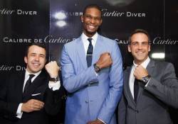 President of Cartier Latin America & the Caribbean, Christophe Massoni, presented two of the new dive watches to Miami patrons, singer/actor Carlos Ponce, and Miami Heat’s Chris Bosh. The Calibre Diver time pieces are true dive watches, with extra thick sapphire crystals and water-resistance up to 300 meters. They meet all the criteria established by the international standard ISO 6425, earning the engraving on the back :”Diver’s watch 300m.”