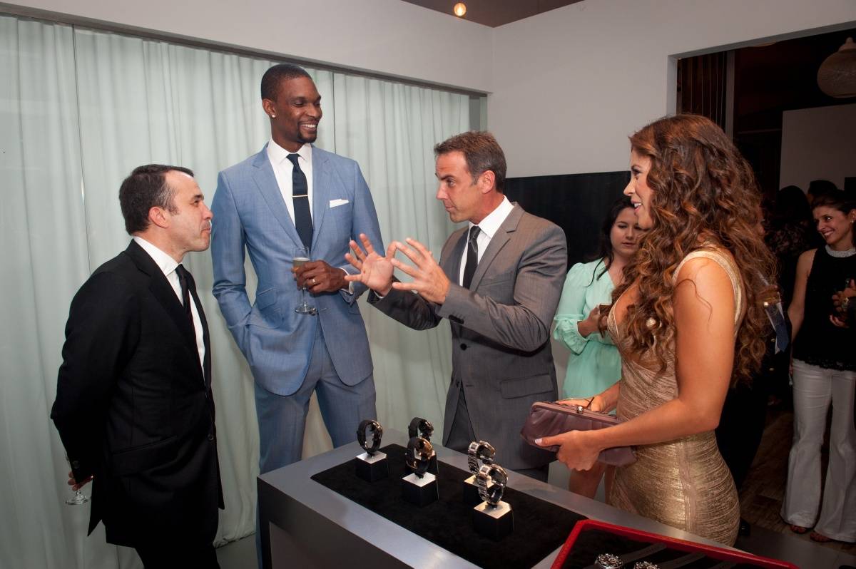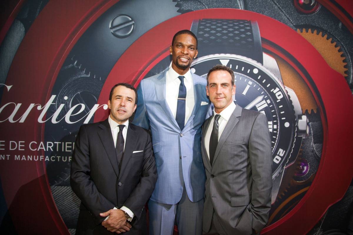 President of Cartier Latin America & the Caribbean, Christophe Massoni, presented two of the new dive watches to Miami patrons, singer/actor Carlos Ponce, and Miami Heat’s Chris Bosh. The Calibre Diver time pieces are true dive watches, with extra thick sapphire crystals and water-resistance up to 300 meters. They meet all the criteria established by the international standard ISO 6425, earning the engraving on the back :”Diver’s watch 300m.”