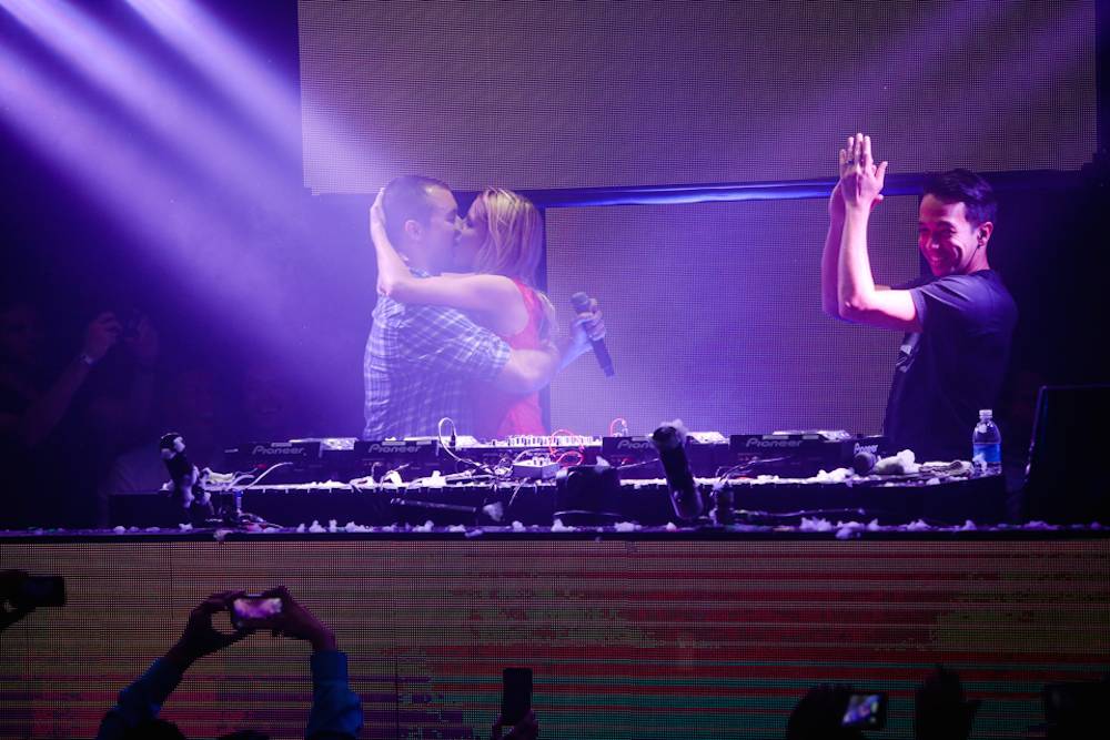 Then it was off to a packed house at Light, where thousands of excited party-goers awaited him. He jumped on the decks at 12:30 a.m. dominating the decks with bass-intensive beats and tracks that quaked the nightclub and had fans on the dance floor all night. During his highly anticipated set he unleashed a monster mash-up of the hottest dance club anthems, while the nightclub’s Cirque du Soleil artists performed breathtaking choreography suspended in the air above the dance floor. Also during his show, one lucky couple got engaged in the DJ booth, making this weekend in Vegas a time for lovers and fighters.