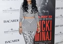She then walked the 1 OAK red carpet wearing an exclusive Brian Lichtenberg black and white “HOMIES South Central” print crop top and skirted leggings that was inspired by moto cross racing. She paired the optical pattern of black and white stripes and checkers with white stilettos, dark shades and wore her hair in simple dark flowing waves. Minaj happily posed for cameras, fans and chatted with the media.