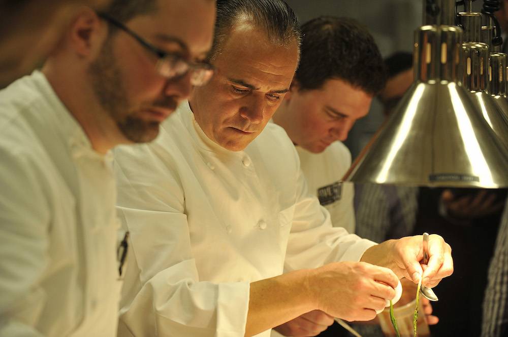 Chef Joel Robuchon greets guest before When in France dinner (credit Isaac Brekken for Bon Appetit)
