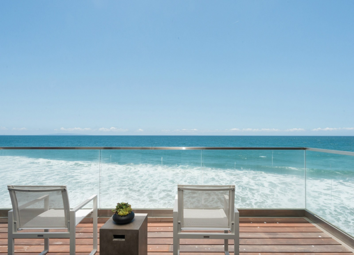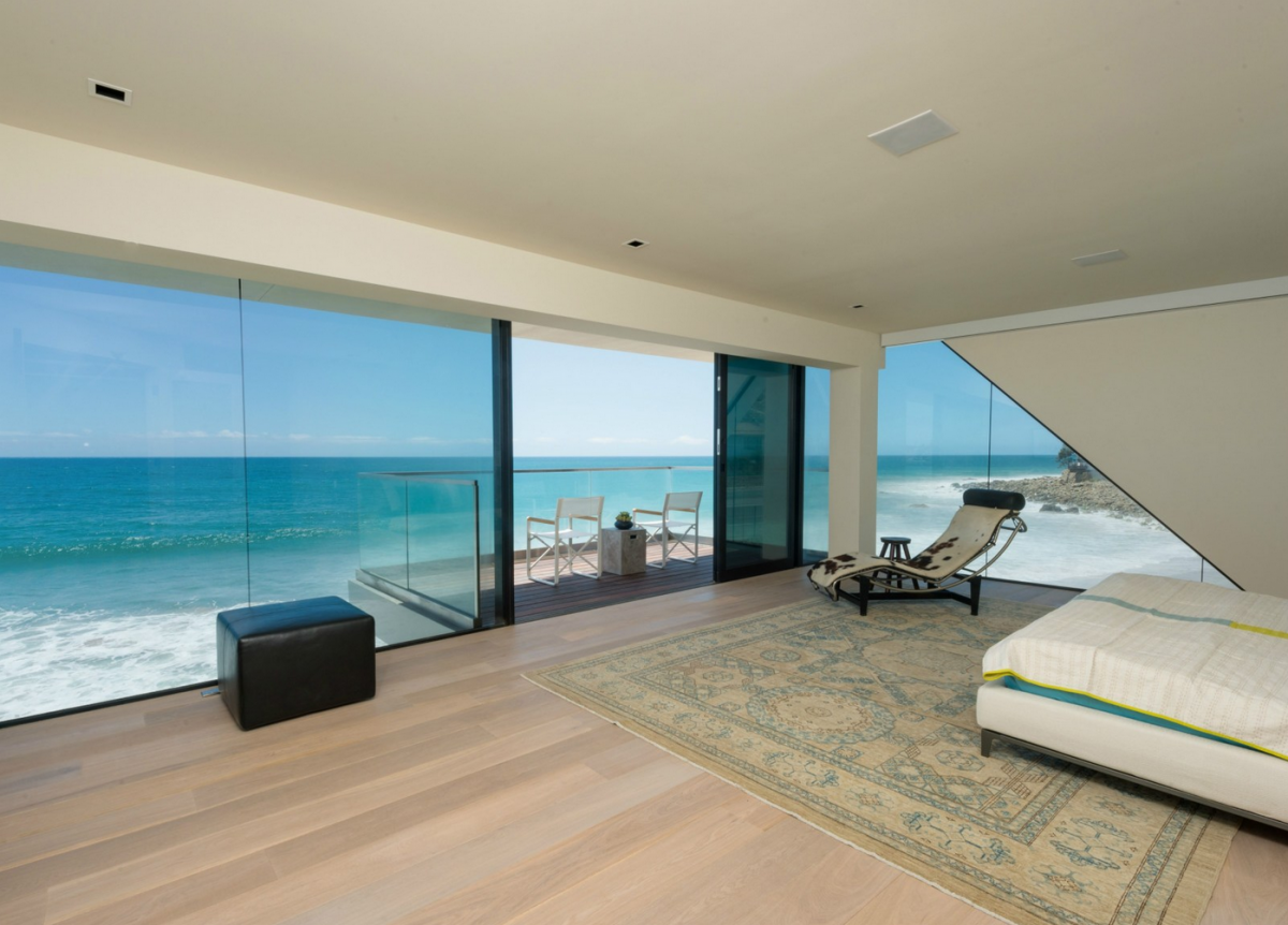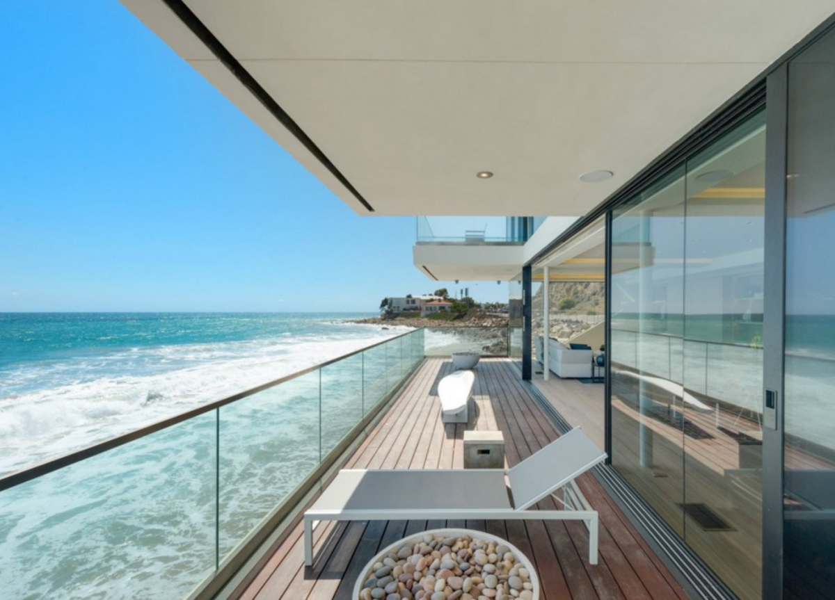 Nestled along Malibu’s Costa Beach, this ultra-modern house was designed to invoke the image of a grand ocean liner floating at sea. Boasting marvelous ocean views, tall glass doors, wide decks, and sculptural fire pits, the luxuriant home comes equipped with a Crestron Smart System, which allows its residents to control its temperature and security from miles away. The property is also outfitted with custom window shades and easily adjustable lighting.