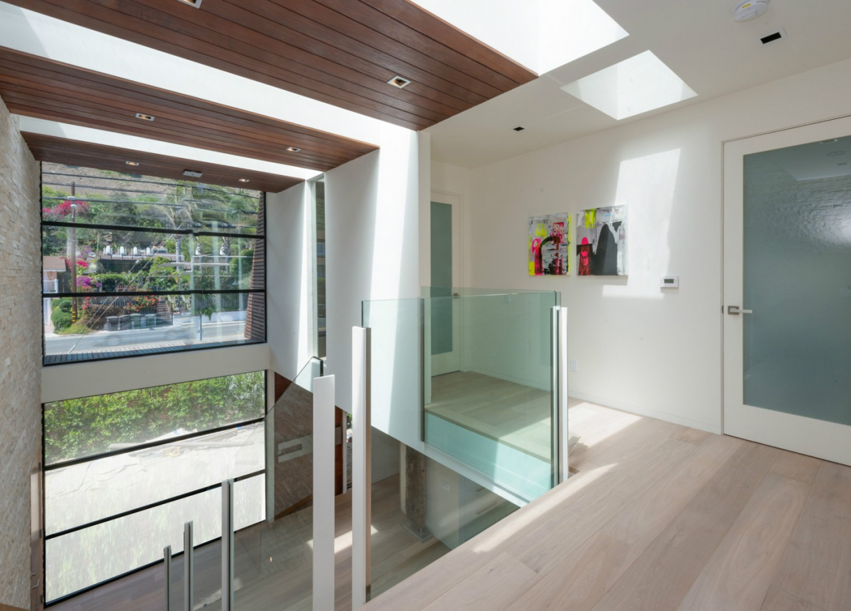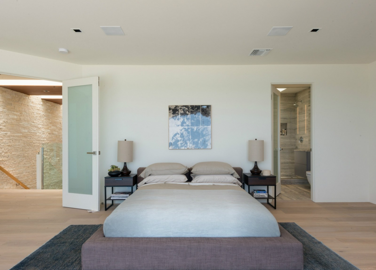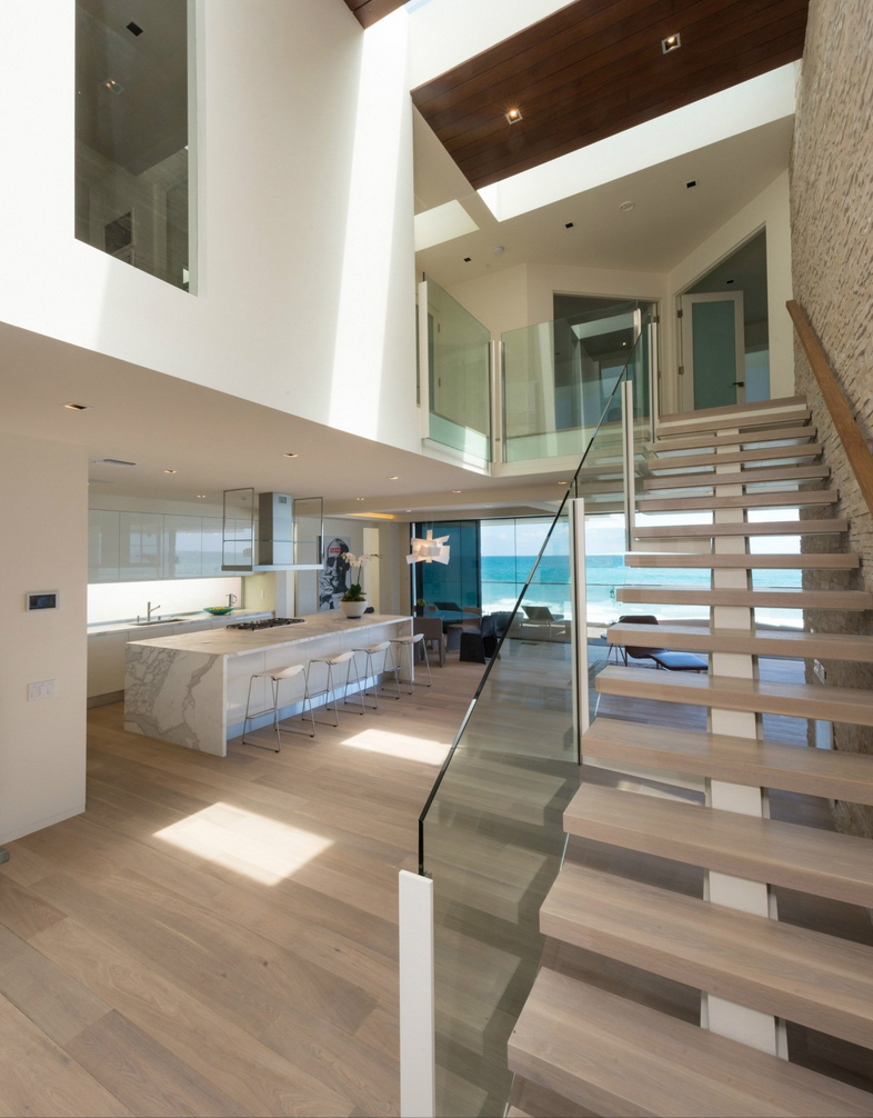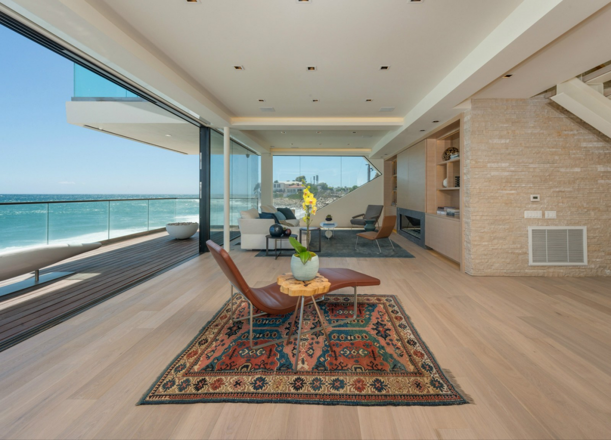 Nestled along Malibu’s Costa Beach, this ultra-modern house was designed to invoke the image of a grand ocean liner floating at sea. Boasting marvelous ocean views, tall glass doors, wide decks, and sculptural fire pits, the luxuriant home comes equipped with a Crestron Smart System, which allows its residents to control its temperature and security from miles away. The property is also outfitted with custom window shades and easily adjustable lighting.