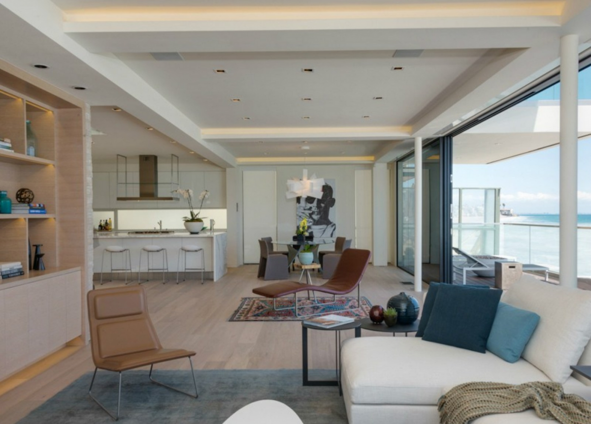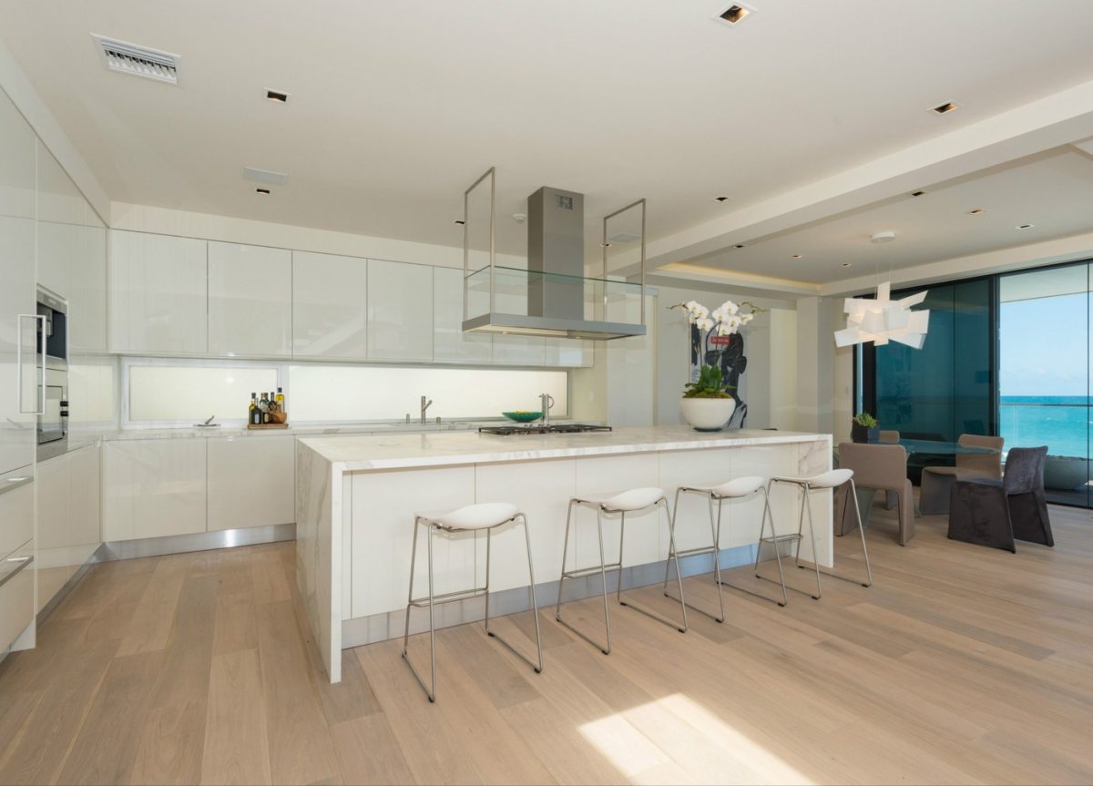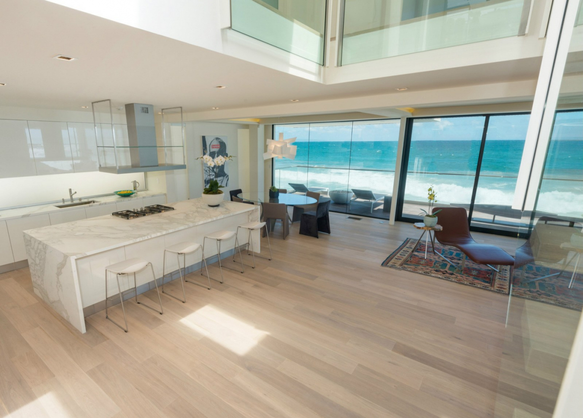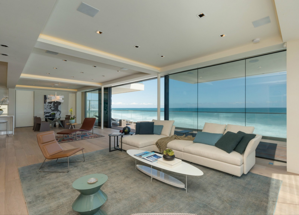 Among its notable features are two oceanfront bedrooms complete with custom closets by Molteni; a white lacquer Italian kitchen that touts a 10-foot, Calacatla stone island, and Sub-Zero and Miele appliances; and a master bath that comes with a television in mirror, steam shower, and Boffi “about water” fittings. The estate also has a European-style stone/olive garden, and ample parking space.