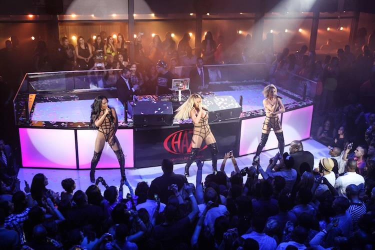 Next the ladies headed inside to a VIP table and posed for more photos before their performance. After a wardrobe change, Danity Kane hit the stage as a sea of fans and party-goers screamed their name. Clad in nude and black bodysuits and over the knee boots, they hit the stage and sang their chart-topping songs “Show Stopper,” “Damaged” and their new single “Lemonade.” They also sang a very special “Happy Birthday,” to singer Travis Garland, who arrived with the group.