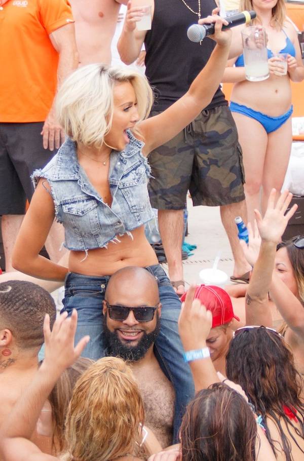 Inside, the were greeted by a sea of exited party-goers and escorted to a cabana overlooking the pool. At 4:30 pm., they hit stage to perform and after their first song, the ladies departed from the norm as they jumped off the stage into the crowd to perform. Next, they surprised guests and plunged into the pool. While in the water and perched on the shoulders of three fans, the group finished their “show stopping” performance with their new single “Lemonade.” After their set, the DK grabbed Liquid super soaker water guns filled with champagne and gave out shots to the crowd.