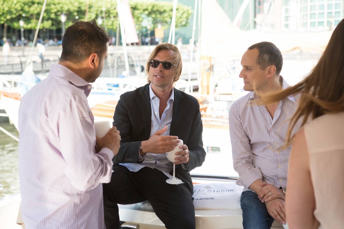 Ferretti Group Showcased the new Ferretti Yacht 750 in the heart of Wall Street for clients, prospective clients, and luxury partners last month. The Ferretti Yacht 750 was docked at the North Cove Marina in the heart of the financial district for a three-day event showcase. On June 24th, the Ferretti 750 was taken for a sunset cruise with existing Ferretti Group clients, prospective clients, and key executives from the luxury partners sponsoring the event including Haute Living and Moet-Chandon.