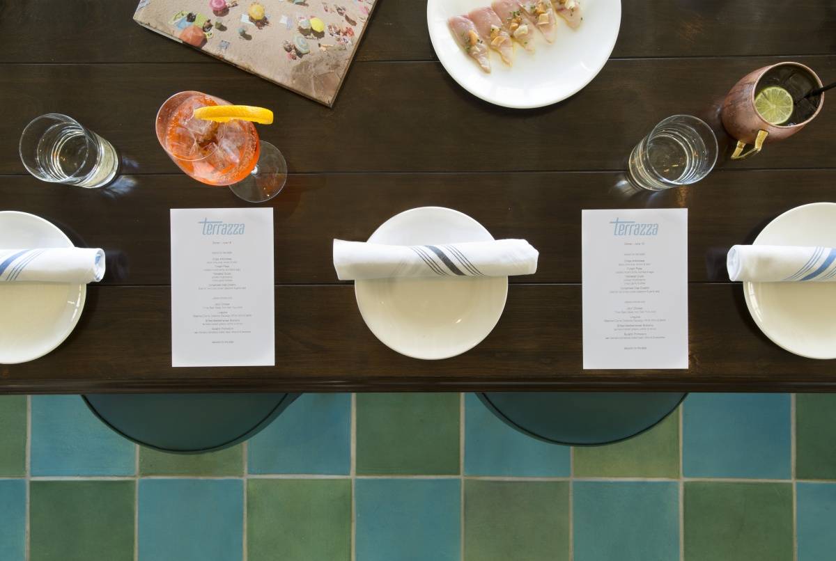 After it’s recent facelift, Terraza (which is an entirely new dining concept for the hotel) has a distinctly Mediterranean feel. Gone is the dark and antique lounge: in its place you’ll find green and blue terrazzo atop colorful ocean-hued Spanish ceramic floor tiles. Adding to the al fresco ambiance are Christian Chaize’s ‘Praia Piquinia’ photographs, forged blown glass pendant lights and blue glass sconces from Murano, Italy.