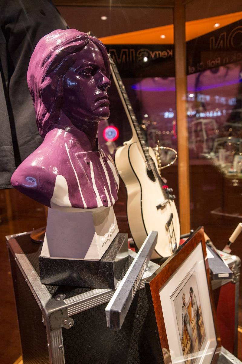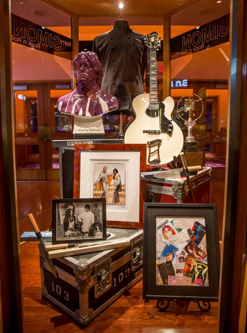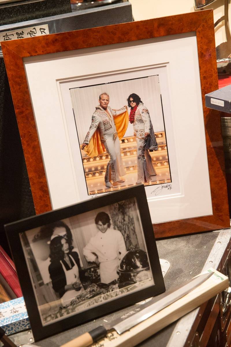 The display boasts a photograph of Simon and longtime friend actor Bill Murray in matching Elvis suits, a bust of Simon painted purple, black chef coat from Simon Kitchen & Bar, autographed guitar, culinary knives, image of him as a young chef with Bianca Jagger and various awards.