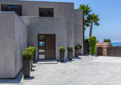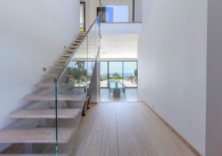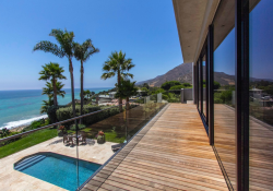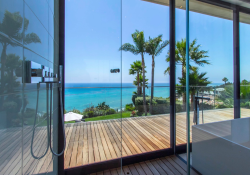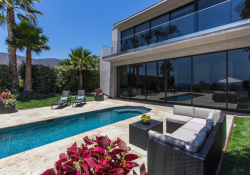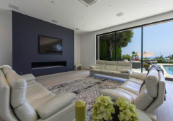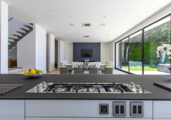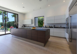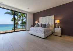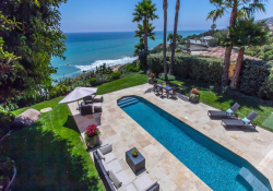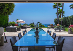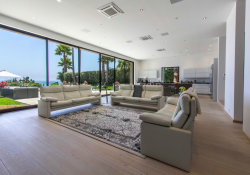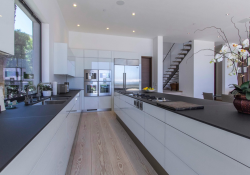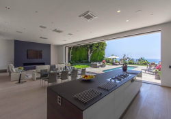This cutting-edge contemporary home rests on Encinal Bluffs with ocean views and access to the excellent beaches of Malibu. The home features 3 bedrooms, 4 baths and an outside wet room, as well as an Elbau kitchen with white glass fronted cabinets and automated cabinet openers, black glass counters, 2 Gaggenau ovens, steam oven and automatic coffee machine. With Dinesen Flooring, the full length planks accentuate the spaciousness and simplicity of the home. Automatic vanishing glass doors create a great indoor-outdoor flow opening from the living space to the outdoor patio and pool area. Taking advantage of the California sun, the house runs on solar panels, making it environmentally and financially friendly.
