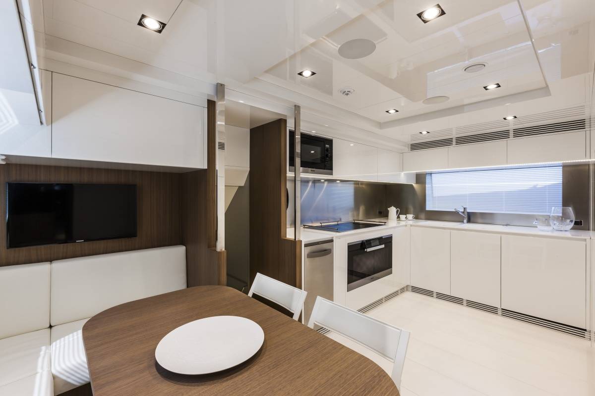 The outdoor areas are perhaps even more impressive than the interior allowing customers total comfort while cruising the high seas. The stern cockpit includes 2 large L-shaped sunpads, coffee tables, and a teak and steel dining table with seating for up to 10 people. From the cockpit access can be gained to the aft swimming platform, which separates the two garage doors.