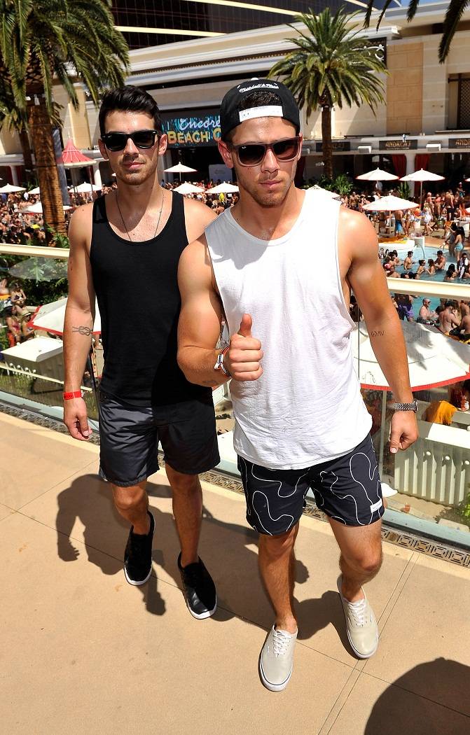 Festivities took place in a cabana overlooking the hot pool party scene below that included DJ sets by Matthew Koma and Martin Solveig. Immediately upon arriving, the brothers, both wearing muscle T-shirts, and a few pals lit up cigars. The group kept refreshed with beer, pitchers of mojitos and Grey Goose cocktails.