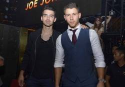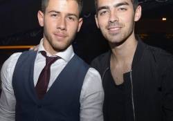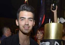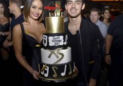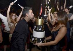 The best medicine for a recent breakup is a getaway to Vegas, and that’s exactly how Joe Jonas celebrated his 25th birthday Saturday night at XS Nightclub at Encore Las Vegas. The handsome crooner was gathered by 30 of his closest friends for an all-out bash. The group arrived shortly after midnight and was welcomed with an entourage of nightlife staff waving wands, popping confetti showers and parading the group through the crowd as the giant LED screen above the DJ booth announced their arrival to screaming fans. Seated immediately next to the stage, the guys quickly paired off with their significant others. Joe was first surrounded by brother Nick and his girlfriend, former Miss USA Olivia Culpo, before breaking off and spending time with several of his fellow bachelor buddies.