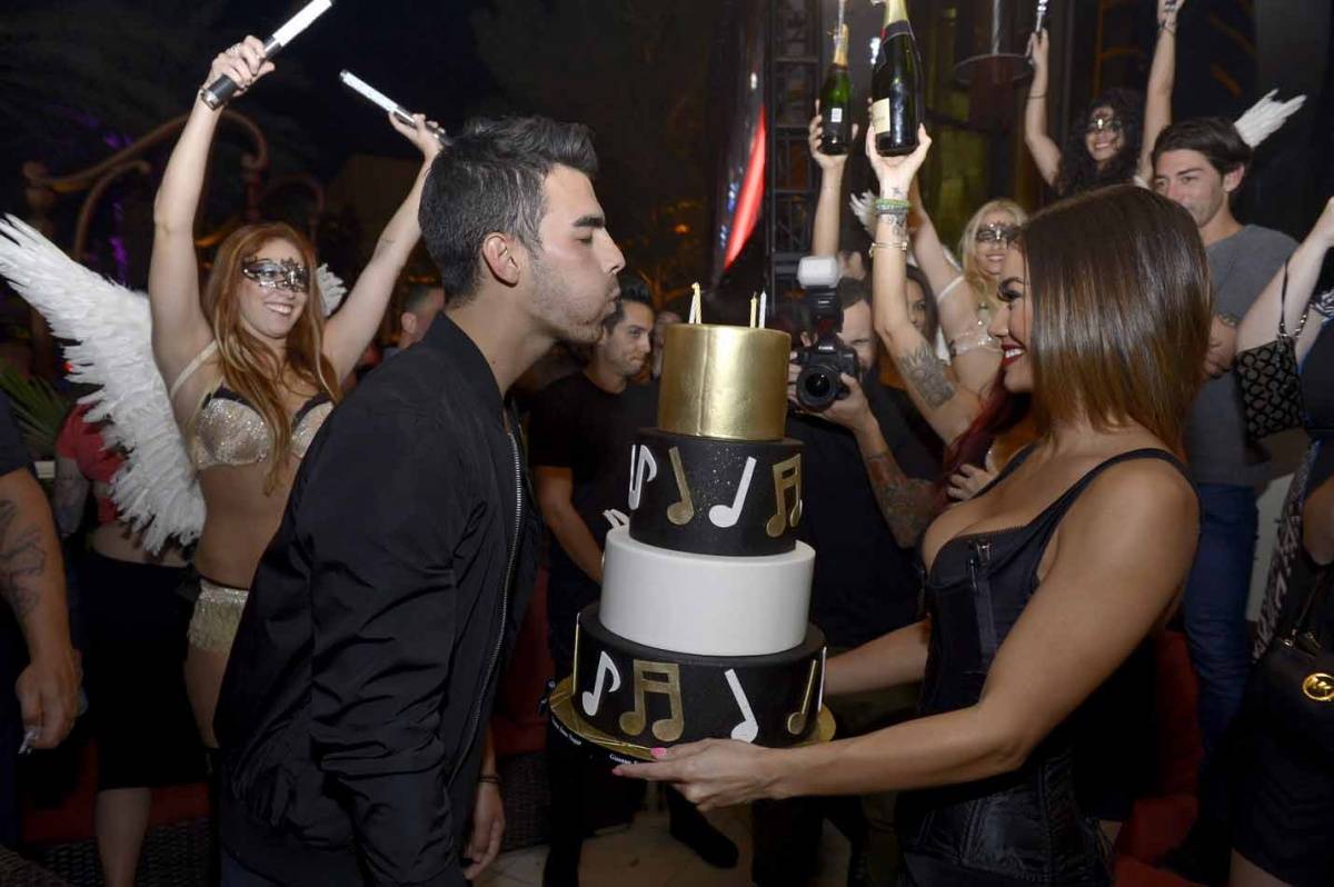 The best medicine for a recent breakup is a getaway to Vegas, and that’s exactly how Joe Jonas celebrated his 25th birthday Saturday night at XS Nightclub at Encore Las Vegas. The handsome crooner was gathered by 30 of his closest friends for an all-out bash. The group arrived shortly after midnight and was welcomed with an entourage of nightlife staff waving wands, popping confetti showers and parading the group through the crowd as the giant LED screen above the DJ booth announced their arrival to screaming fans. Seated immediately next to the stage, the guys quickly paired off with their significant others. Joe was first surrounded by brother Nick and his girlfriend, former Miss USA Olivia Culpo, before breaking off and spending time with several of his fellow bachelor buddies.