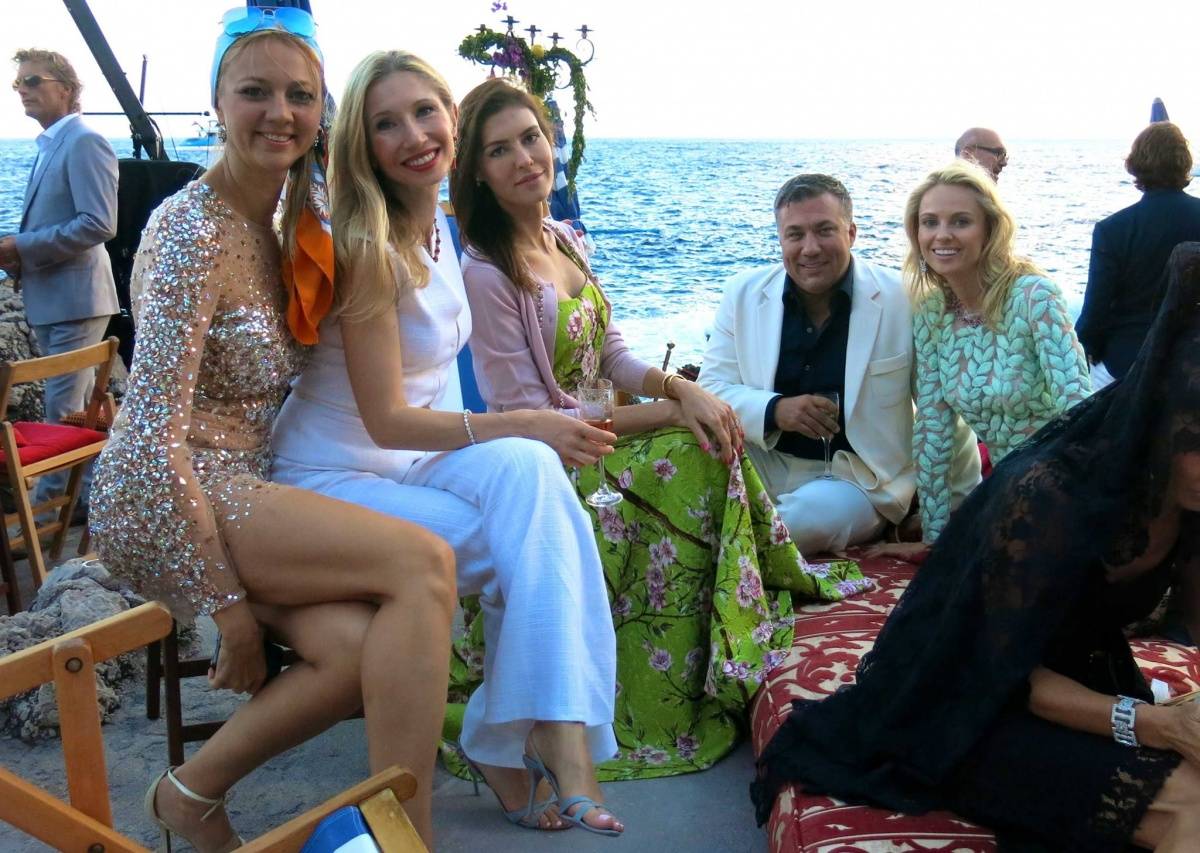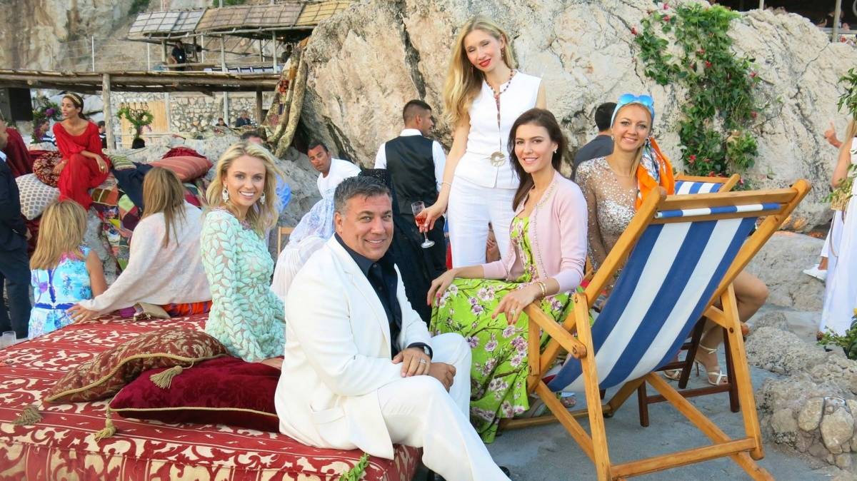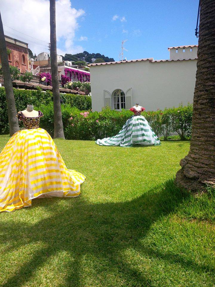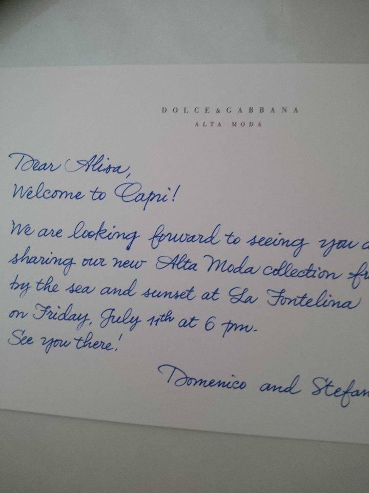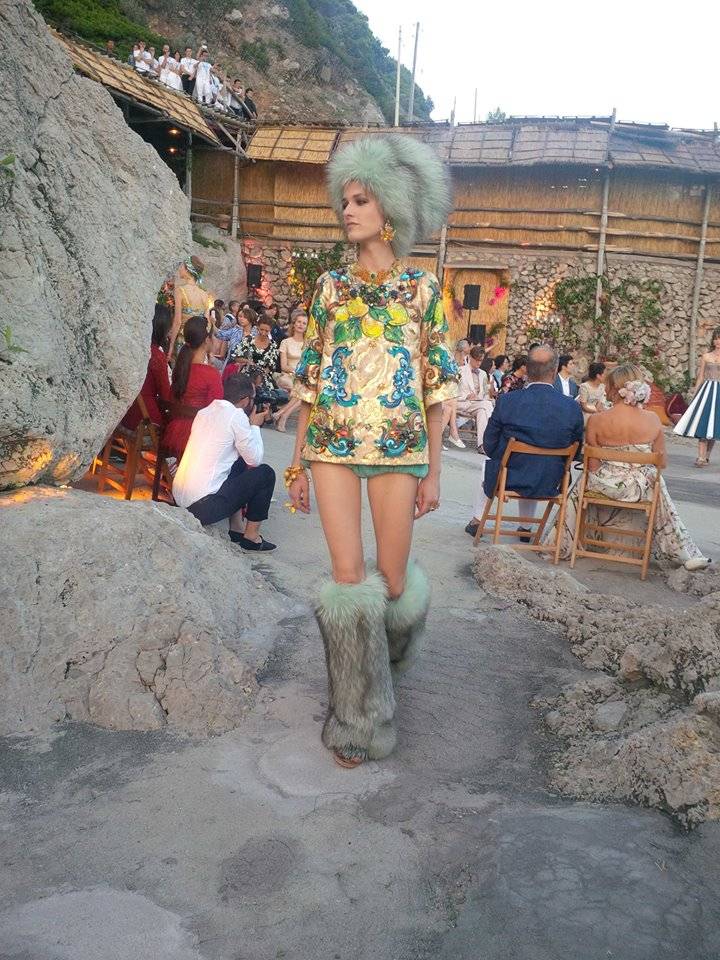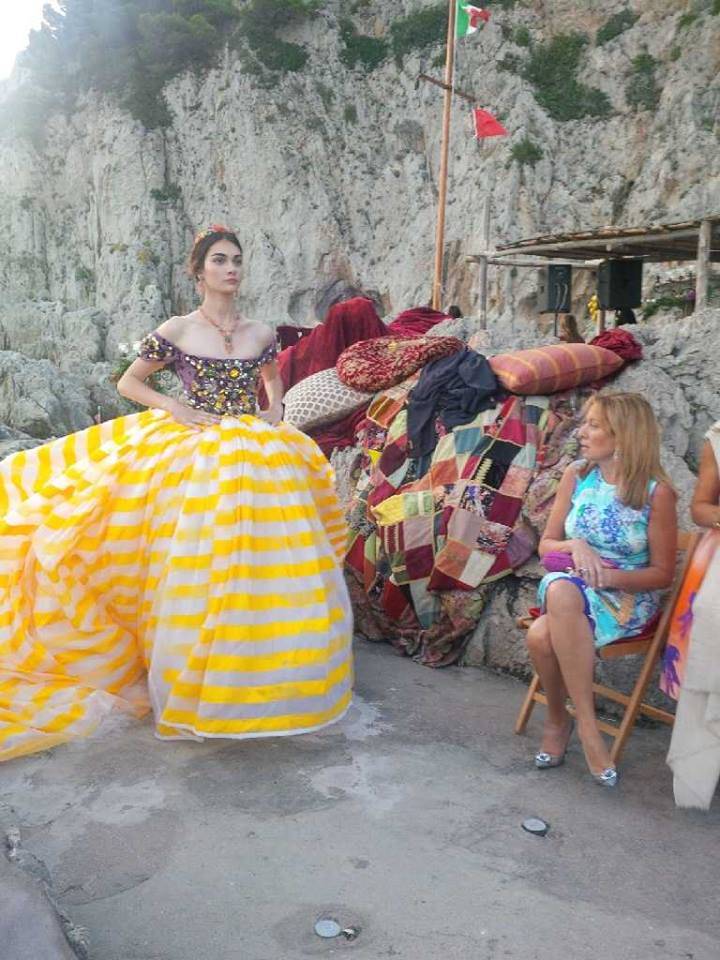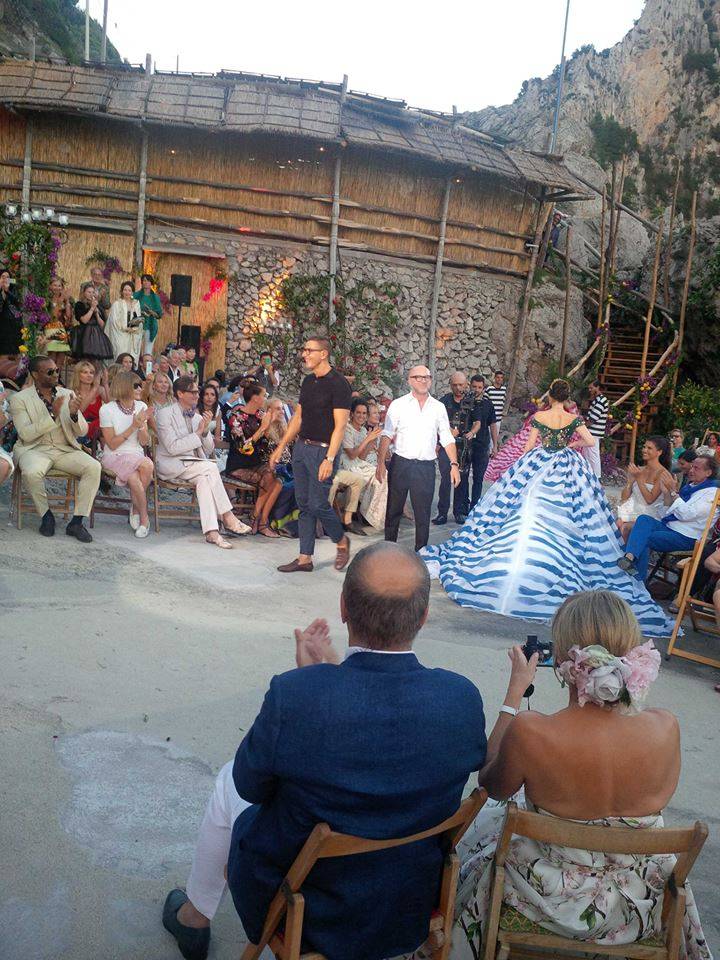 Last week I was invited by Dominico Dolce and Stefano Gabbana to Capri, Italy, for their Alta Moda fashion show. This was not just a fashion event – it was an action-packed weekend. The previous Alta Moda collection that I attended two years ago was in Mr. Dolce’s native Sicily – a weekend that included a performance of the opera “Norma” at Taormina’s ancient Greek Theatre – and last year I went to Venice, where we all went to an elaborate masked costume ball. This year’s event was four days. From the moment I landed Thursday at Naples airport everything was organized down to the second. Greeters in Dolce Gabanna shirts met me at the airport and drove me to the Dolce Gabanna boat, which brought me to Capri from Naples. All the guests had rooms reserved at the famous Quasisana Hotel. Upon arrival I received beautiful welcome gifts with a hand written note from Dominico and Stefano Gabanna. That night we all attended a welcome dinner provided by Stefano and Dominico. Friday night we were all taken to a secret location by private boats to see the show. The show was located in a the private island not far from Capri. We all sat on pillows and couches around the rocks of the famous Faraglioni cliff. After the show we had dinner at La Fontelina restaurant on the beach. I was seated next to actress Jeniffer Tilly who loved the collection. The evening’s dress code was “dolce vita in the 1950s and 1960s.” The gorgeous, open-air dinner featured more than 15 dishes passed around family-style. The following day we all had lunch at the house of Dominico Dolce and Stefano Gabbana. Each Alta Moda weekend concludes with a riotous party and this one involved dancing on tables strewed with bottles of Dom Pérignon while a band played midcentury Italian favorites as guests took turns at the microphone on stage. Mr. Dolce danced in a shirt and shorts printed with red hot peppers – a good-luck symbol on the island. Mr. Gabbana, wet with perspiration, shimmied and swayed in a pink wig with braids while guests sang every verse of “Volare” in Italian at the top of their lungs. At one point Domenico took to the stage to sing, with Eva Herzigova on tambourine, while Stefano shared his treasured collection of wigs with the men in the audience, egged on by the likes of Ulyana Sergeenko, Anna Dello Russo, Coco, Bianca and, Georgina Brandolini and Giovanna Battaglia. On Sunday it was time to leave and most of the guests – including me – went to St. Tropez for Carol Assher, Gihad Saad, Monoca Baccardi, and Tony Murray’s parties. We will always keep memories of Capri in our hearts.