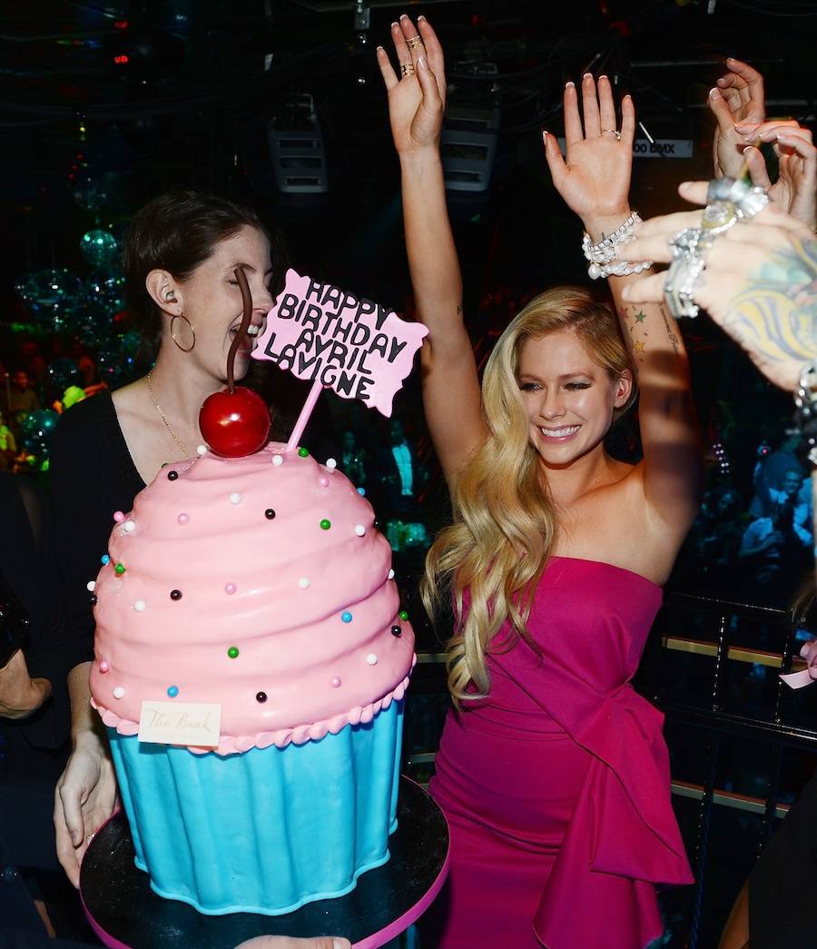 Inside, Lavigne was escorted to a private VIP table above the nightclub’s dance floor. Shortly after arriving at her table, The Bank Nightclub staff surprised the singer with a gigantic birthday cupcake — a nod to Lavigne’s “Hello Kitty” music video. Partygoers sang “Happy Birthday” to Lavigne as she posed with the cake and danced with gal pals to Rihanna’s “Cake.”