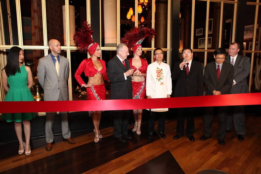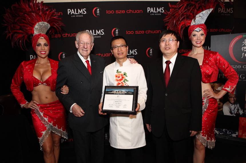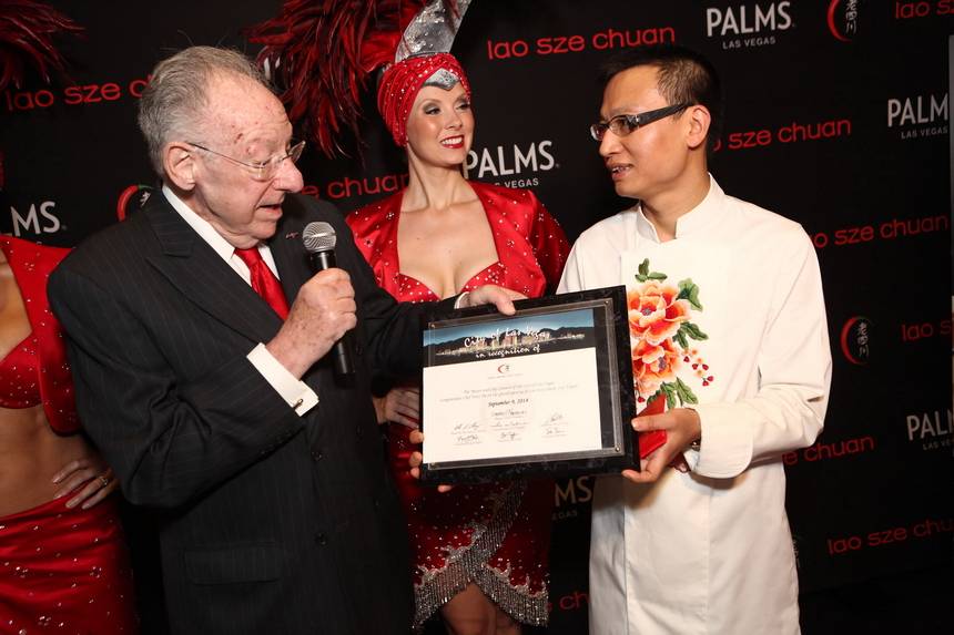 Chef Tony Hu threw a grand opening party for his new Lao Sze Chuan, now open at the Palms. The authentic Chinese cuisine restaurant kicked off its Tuesday night party with a ribbon cutting ceremony led by Hu, former Mayor of Las Vegas Oscar Goodman, and the restaurant’s key partners. Goodman gave Hu an official Las Vegas welcome with his signature Bombay Sapphire Gin cocktail in hand, with a Szechuan pepper replacing his usual garnish of choice, a jalapeño, to signify his excitement for Lao’s hot opening. When welcoming Tony to town, Goodman playfully introduced Hu by saying, “They call him the mayor of Chinatown in Chicago and if you try to become the mayor of Las Vegas here, I will have you whacked.” Afterward Hu was presented with a formal proclamation and certificate marking his first Las Vegas venture.