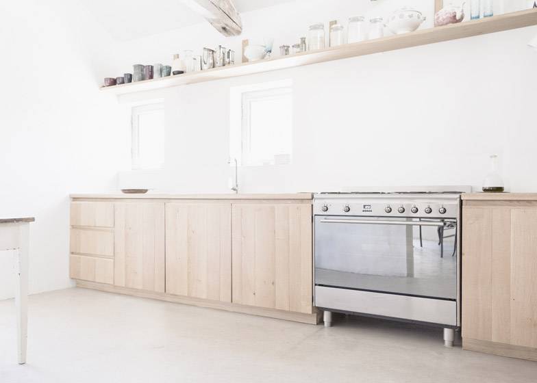 To “gently” preserve the building’s initial look, the architects used rugged materials with natural appearances, and hired a local craftsman to complete the oak doors, kitchen elements, wardrobes, and shelves. Additional modern updates included the installation of floor heating, large windows, and glass doors, and the insulation of the ceiling and walls.