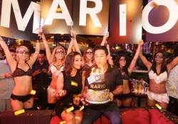 Once they got settled, the XS Angels presented Mario with a three-tiered black and gold birthday cake. He posed for photos as confetti poured down and the XS Angels waved sparklers and signs spelling out “Mario.”