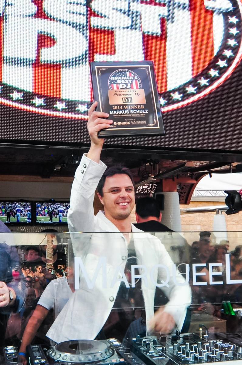 DJs Lema, Kennedy Jones and Cash Cash were all on-hand to set the soundtrack for the wild afternoon affair, leading up to a set from the man of the hour. Shortly before kicking off his set, Markus Schulz was joined in the DJ booth by DJ Times Magazine editor Jim Tremayne, who presented Schulz with a plaque reflecting his new title as well as a 24 karat gold mixer from Pioneer DJ.