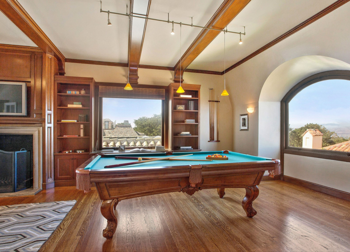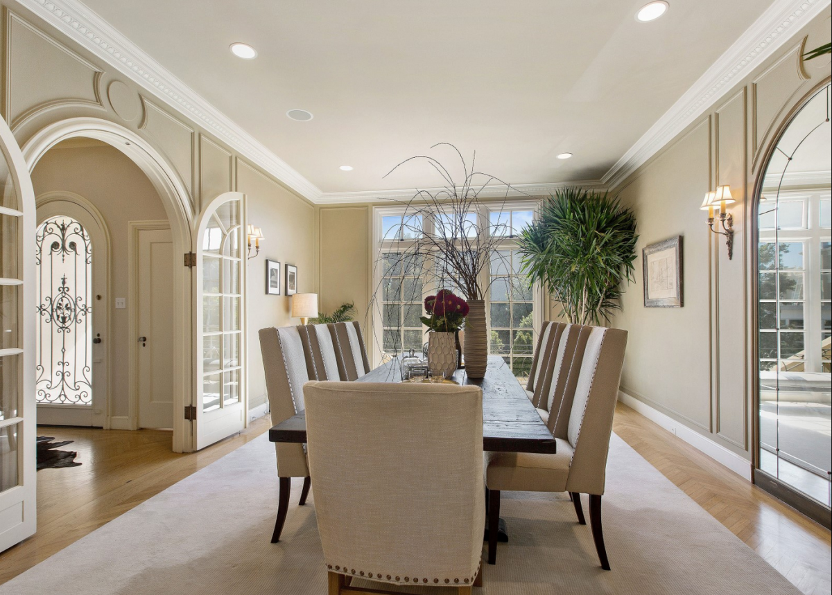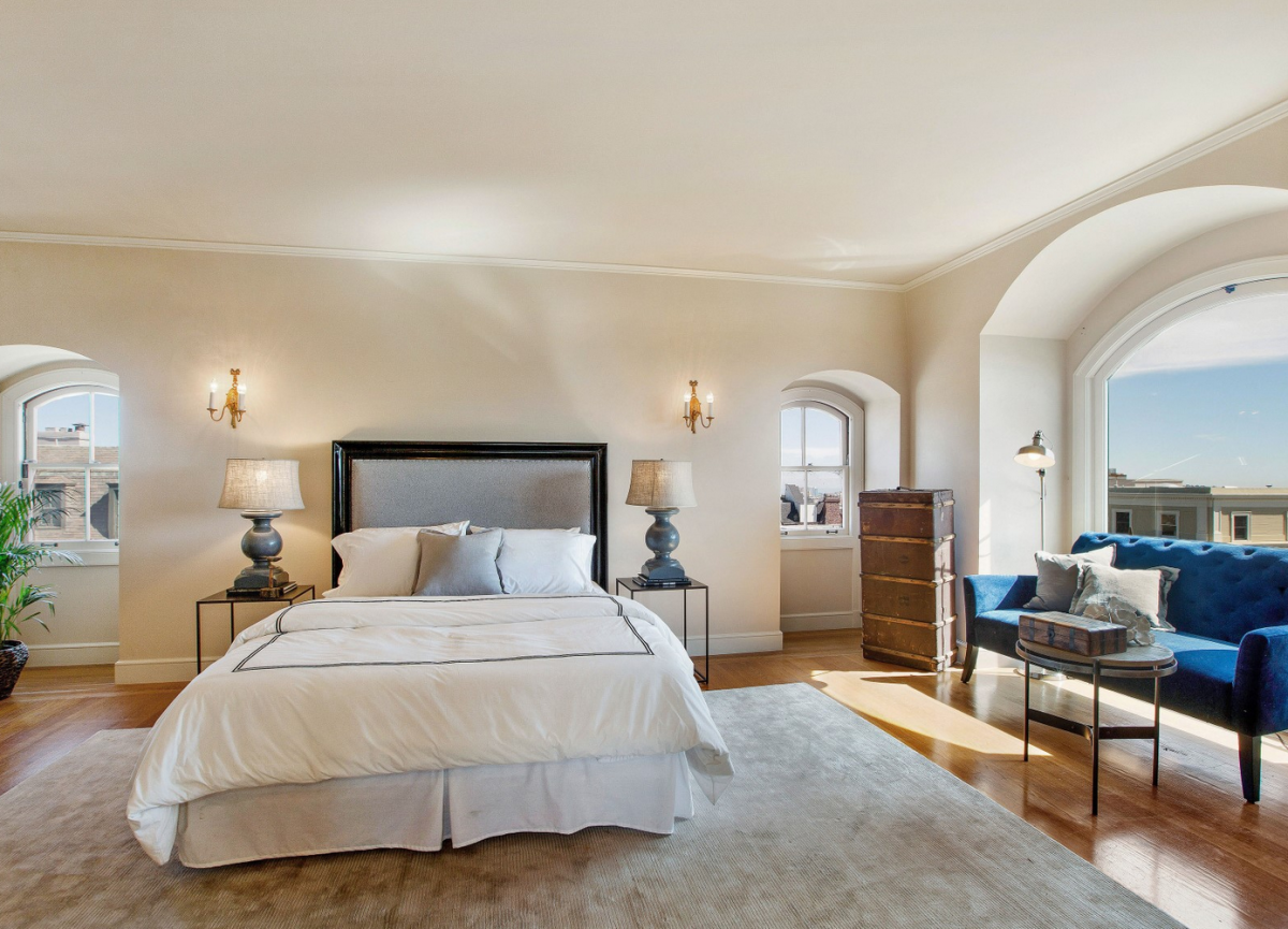 This French-style, three-story residence boasts five bedrooms and six-and-a-half baths. Its formal entrance showcases a cascading circular staircase, and off its entrance lies a living room with built-in stereo speakers and a fireplace. The grand foyer also leads into a formal dining room, while an open dining room sits in the rear of the home, along with a family room and a kitchen with French doors that open up to a patio and hot tub. The house’s second floor features a luxurious master bedroom suite with dual baths, plus two additional en-suite bedrooms. The third level has a spectacular entertaining room, complete with a wet bar and views of the Golden Gate Bridge and Sutro Tower. It also houses an office with stunning bay views, not to mention another two bedrooms and two baths. An exercise room, wine cellar, and three-car garage can be found on the property’s bottommost level.