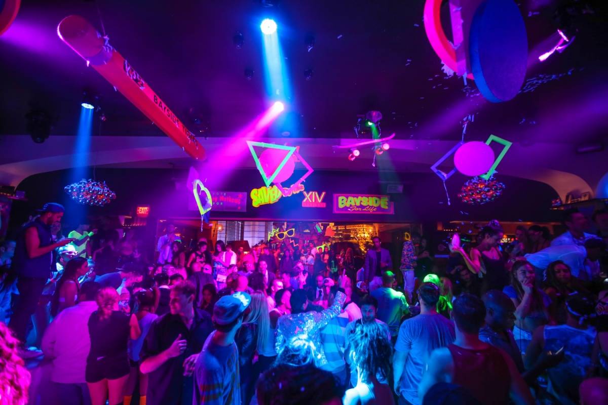 Diamond and Haskins hung out at a VIP table overlooking the dance floor inside the Bayside High-themed venue. Not your typical school dance, Hyde was transformed with oversized throwback essentials like trapper keeper notebooks and cassette tapes, complete with school bus bottle presentations. Neon-clad partygoers, festively dressed in their best 80s and 90s gear with crop tops and fanny packs, danced throughout the evening to beats spun by DJ Julian Ingrosso, who was joined by Diamond and Haskins behind the DJ booth.