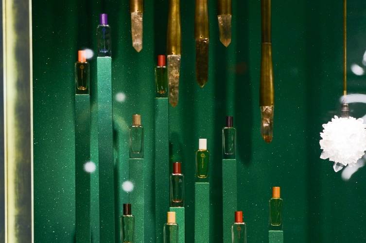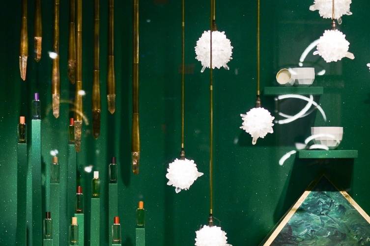 Boots is a Melbourne based industrial designer driven by a love of nature and light. In his artfully designed windows he incorporates Hermés goodies such as printed scarves, bowl candles, jewelry, painted ceramics, a white crocodile Birkin and its many fragrances, into each window. The products are juxtaposed against lighted quartz-like minerals or stones which look like they were recently mined from a quarry. The minerals are bound into shapes and emanate light resulting in an other-worldly effect. Backgrounds are painted roughly and in an off-hand manner in cerulian blue and emerald green. The theme is “Metamorphisis” and although its not entirely clear what Mr. Boots is saying, it seems to be a comparison of the natural worlds and the pursuit of selling. Boots wants us to think about the origins of the items we buy in these thought provoking window displays.