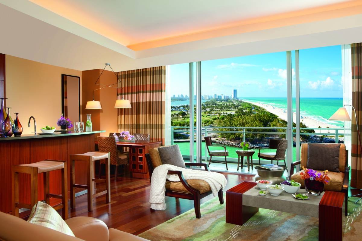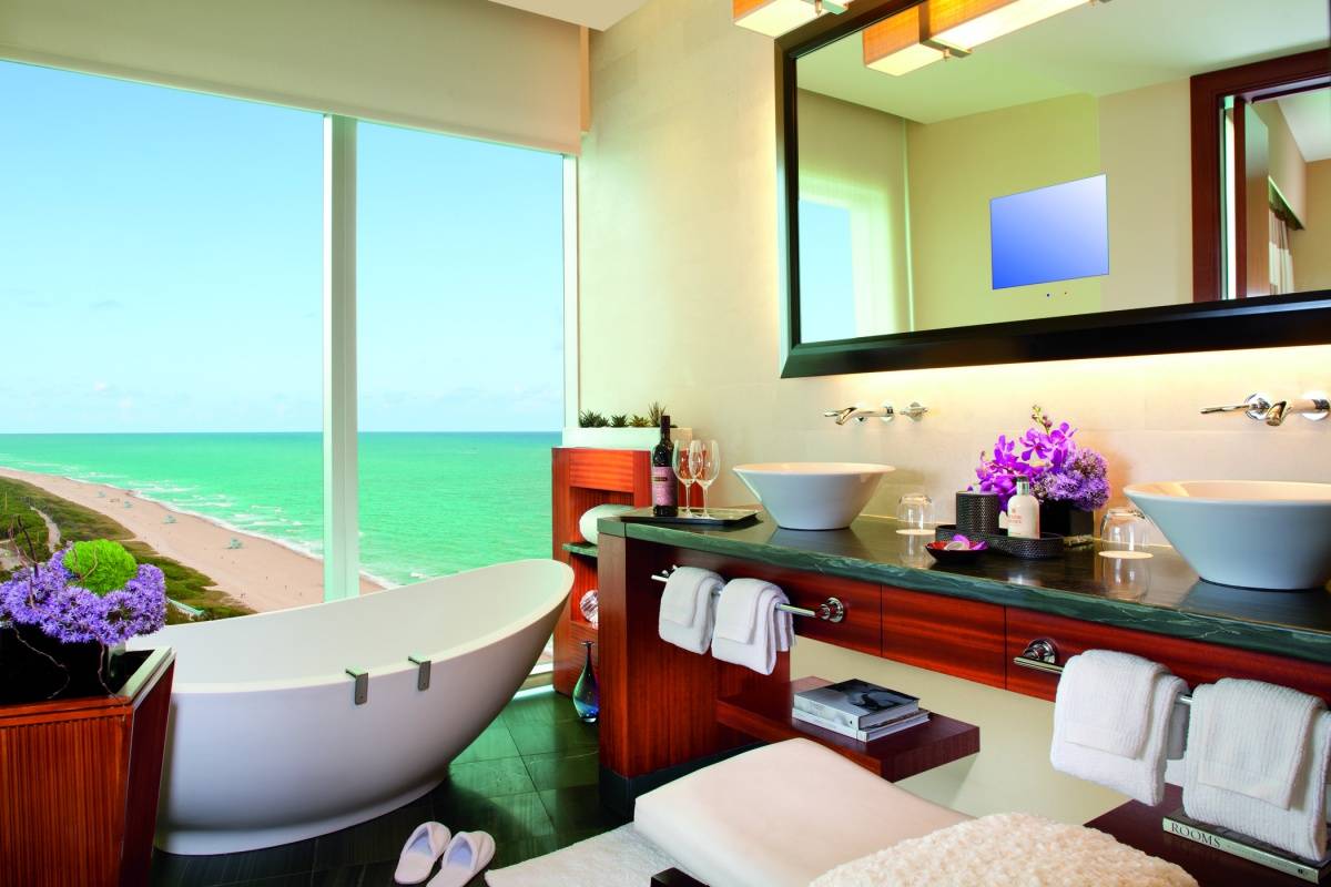 Clocking in at the tenth Ritz property in the state of Florida, the Ritz-Carlton Bal Harbour boasts 18 stories of guest rooms with floor to ceiling sprawling vistas of the Atlantic and Intracoastal water way. Each floor opens up to a semi private lobby, with doors to a one bedroom suite and standard hotel room, which can be combined into a two-bedroom suite. “This particular layout and availability to close off an entire floor is perfect for royal families,” says Communications Manager Richard Lemus. Guestrooms feature dark polished wood floors, ample workstations, and modern bathrooms that are like personal spas. Think stand-alone egg-shaped tubs with floor to ceiling windows and clandestine TVs that are part of the mirror.