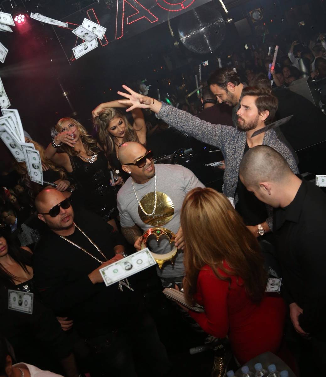 After dinner, Disick walked the red carpet at 12:30 a.m., stopping to take pictures. He was excited to talk about baby number 3 on the way. When he got to his VIP table behind the DJ booth, Disick settled in, sipping 50 Bleu cocktails and immediately spraying champagne all over the crowd. Later in the evening, a member of 1 OAK’s staff wearing a jeweled crown presented Disick with $5,000 in “Scott Disick dollars.” “Lord Disick,” delighted by the funny money with his picture, grabbed the cash and made it rain, sending Disick dollars flying everywhere. Disick and friends continued to party, enjoying cocktails and spraying champagne until 2 a.m.