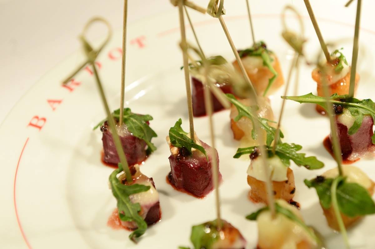 Guests experienced a night of French extravagance on the Las Vegas Strip beginning by being greeted with a red carpet, made by the train of a rose-covered Parisian model’s dress. The event featured cuisine such as Mina’s foie gras parfait, an extravagant raw bar and a charcuterie display. Passed hors d’oeuvres included miniature versions of Bardot signature dishes, including the croque Madame and warm beet and goat cheese salad as well as the chocolate macaron, the crème caramel and the lemon meringue tart.