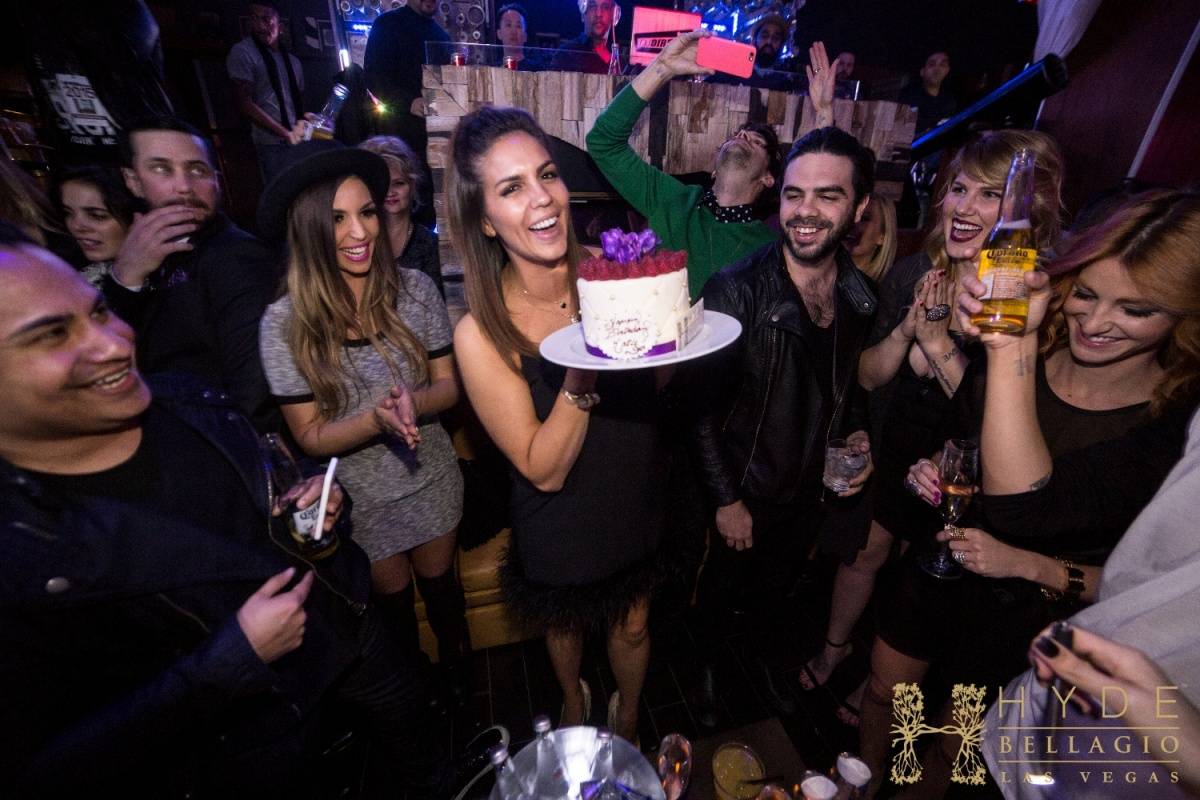 After dinner, the party continued at the fountain-side hot spot Hyde Bellagio. Maloney was greeted inside Hyde with flashing lights and letters spelling out her name. The group drank Grey Goose vodka and Patron cocktails throughout the evening. Later, Maloney was surprised with a custom white and purple birthday cake decorated with her favorite flower, the purple tulip.