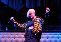 Just after midnight, Australian singer/songwriter Betty Who and her entourage settled into a plush VIP booth next to the center of the stage. Shortly after 12:30 a.m., she took to the mic to belt out her energetic songs! Donning a gold and black sequin blazer paired with a black crop top and flirty skirt, she performed an energetic five-song set, including her No. 1 Billboard hit, “All of You” before posing for photos with excited fans.