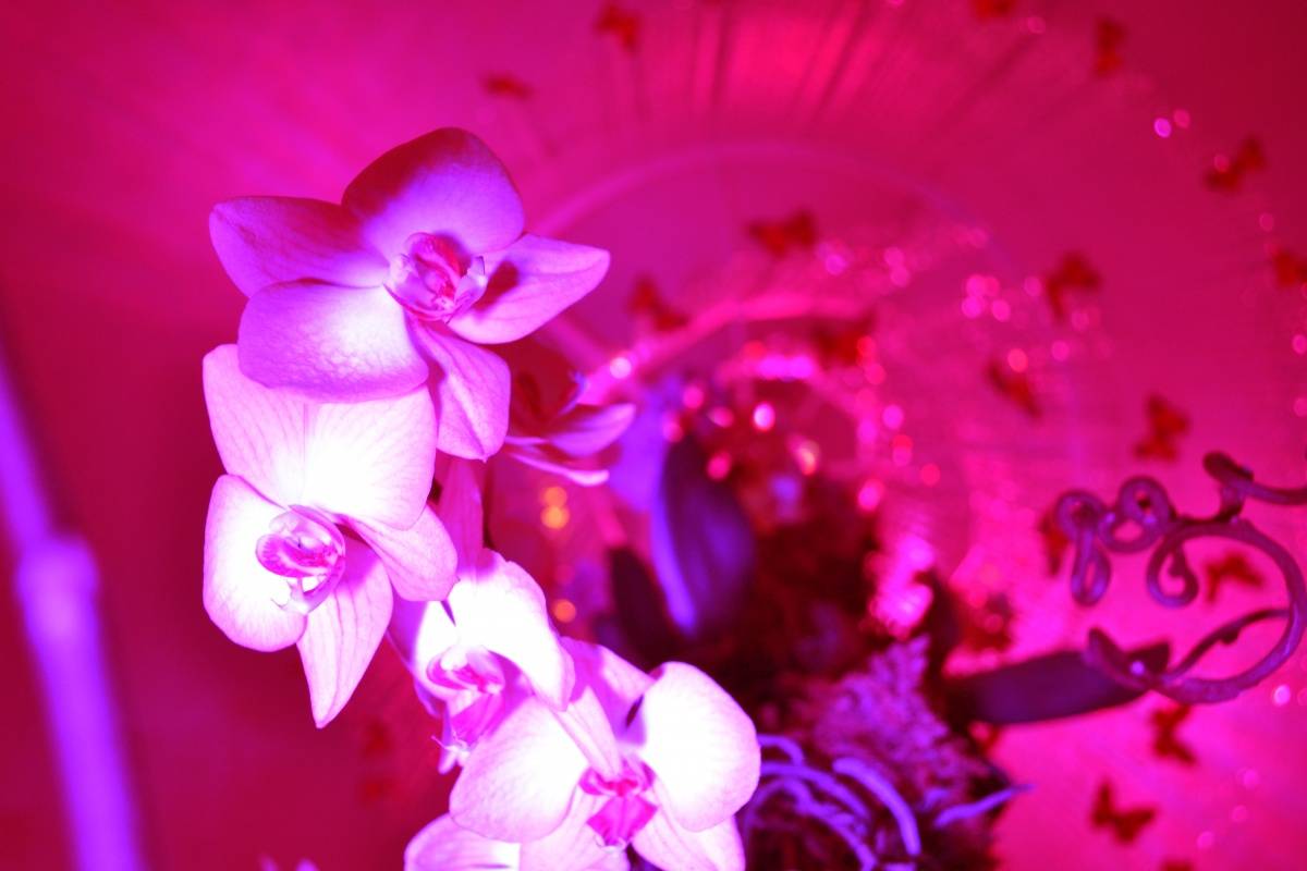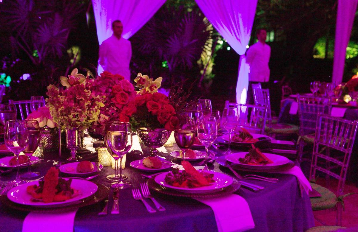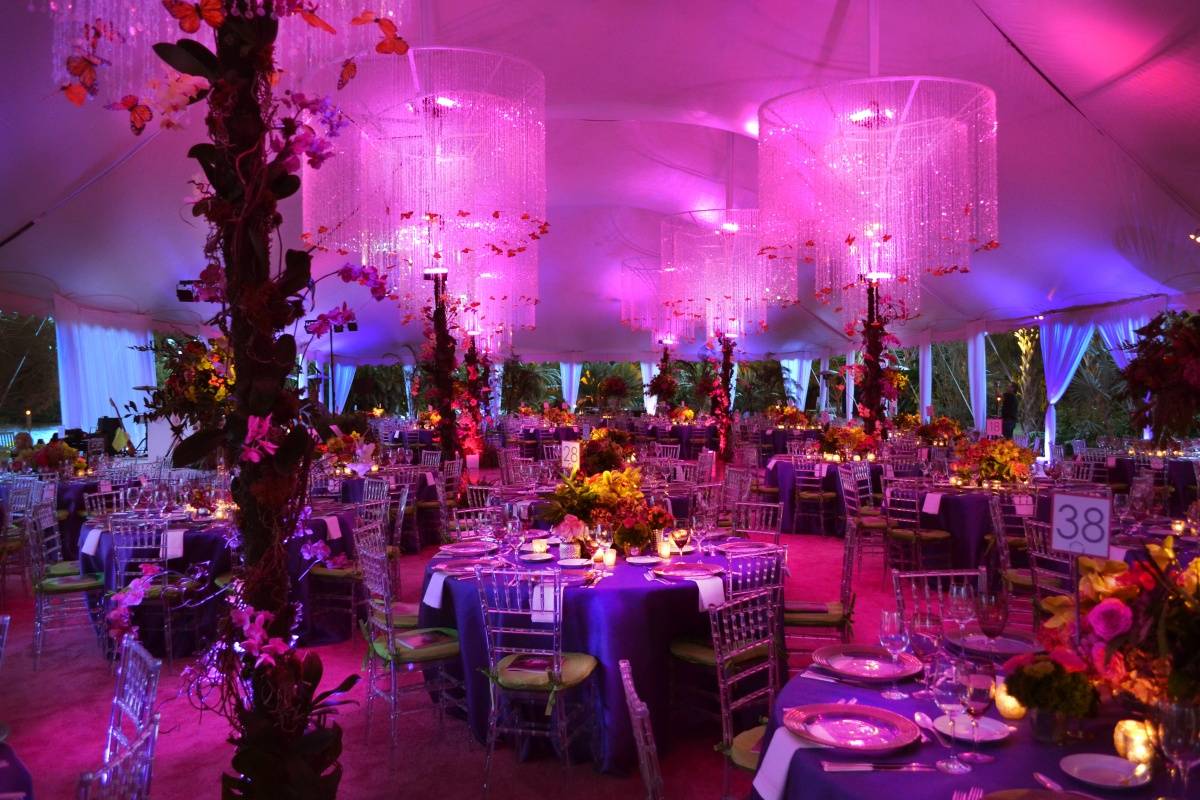 Inspired by Chihuly’s rich tones of cobalt blue and purple glass, Alejandro Muguerza, President and creative force behind Le Basque, began by transforming eight large center poles into spiraling, cascading chandeliers; shining bright with tones of fuchsia lit from within. The tablecloths mixed shades of cobalt blue, purple diplomó and intense fuchsia, and each were topped with green centerpieces containing seasonal flowers and vibrant orchids. Accenting large round tables with vivid green and cobalt blue chargers – and placing them on hot pink carpet, dotted with translucent chairs with green cushions – the room was as magical as it was artistic. Combine that with its warm shades of pink and amber lighting, and a menu of gourmet favorites like tomatoes and black olive tapenade, pumpkin risotto, beef tenderloin, goat milk and lavender panna cotta, and more; and the evening was nothing short of exquisite.