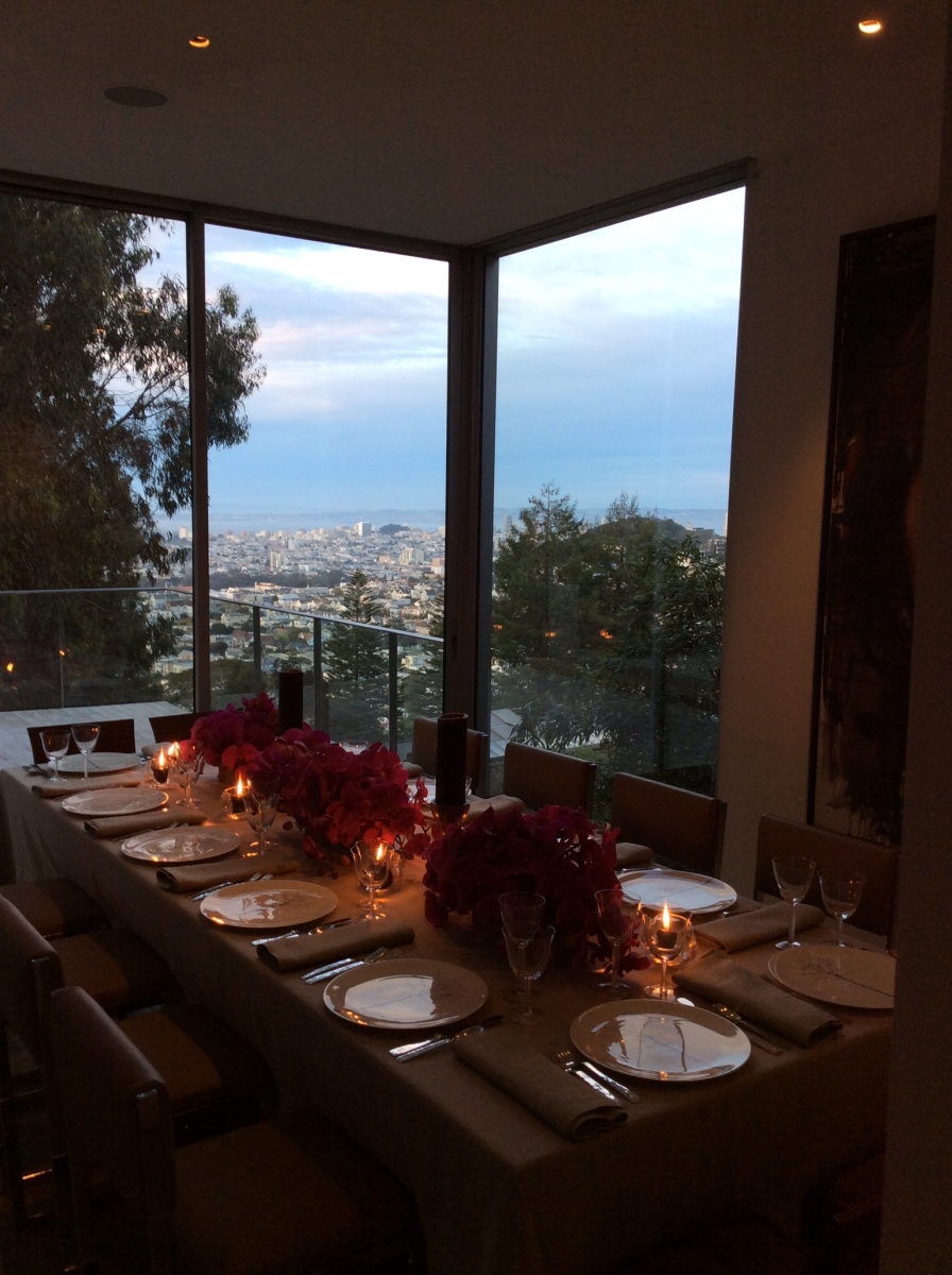 So on March 20th, after two nerve-racking days of preparation including emergency chair reupholstery, twelve good friends enjoyed very special gourmet dinner with amazing views and incredibly chic decorations at Stanlee Gatti’s beautiful residence. It was all put together by the two very creative minds of Chef Charles Phan and Event Designer Stanlee Gatti.