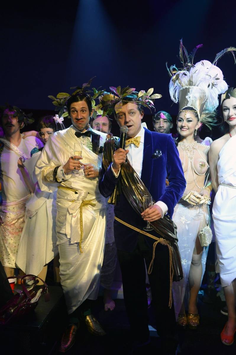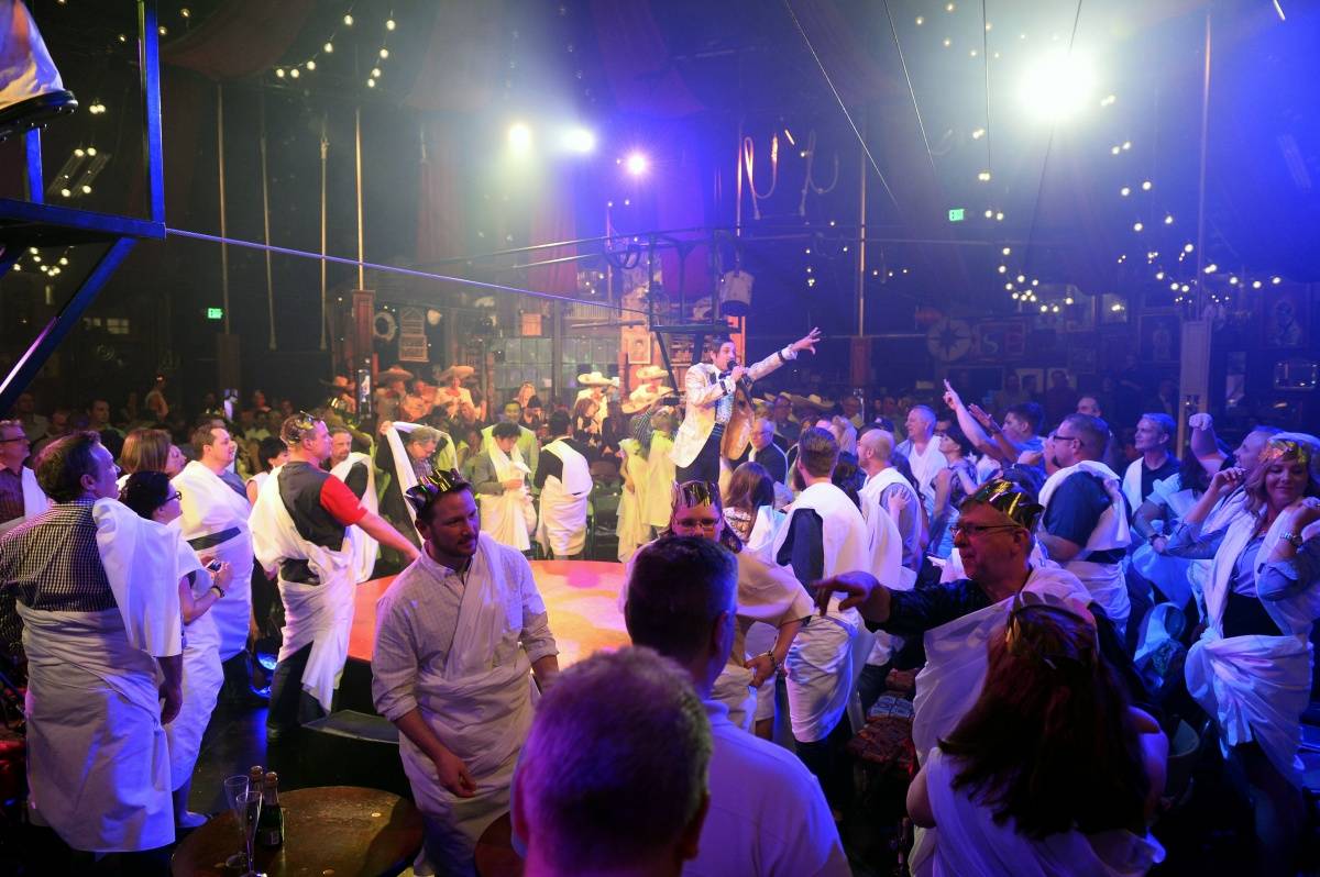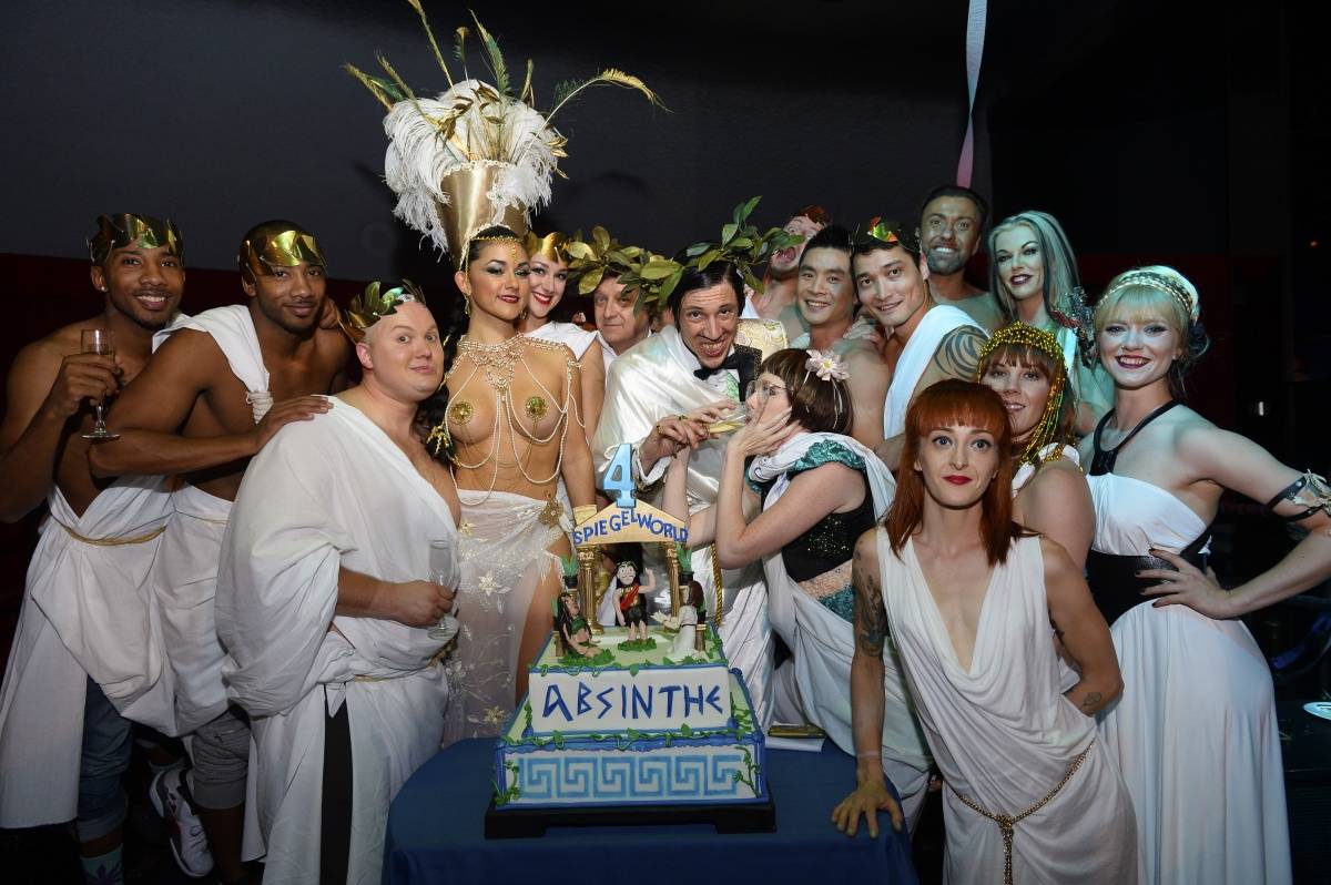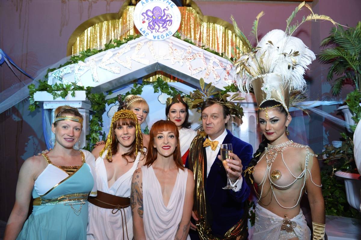 Absinthe by Spiegelworld at Caesars Palace celebrated its fourth anniversary, more than 2,000 performances and one million guests in Las Vegas on Wednesday night. Following a full standing ovation during the show’s finale, The Gazillionaire, Joy Jenkins and the rest of the outlandish cast surprised revelers with the announcement of a toga party in The Gossy Room at Caesars Palace. With the help of the Absinthe crew, guests donned their best togas and the party kicked off with a mariachi band procession winding from the Spiegeltent through Caesars Palace with guests in toe chanting “TOGA, TOGA, TOGA” on the way to The Gossy Room.