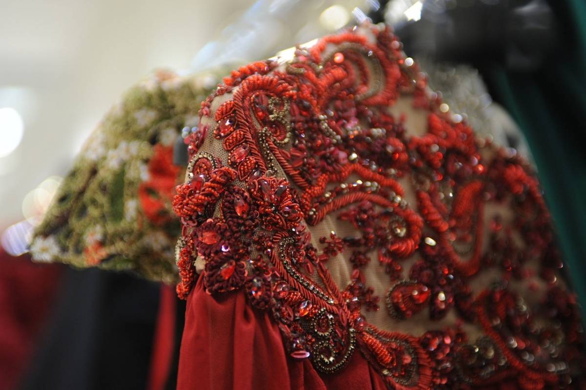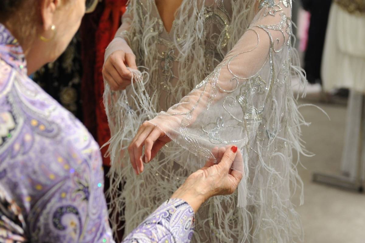 KC: We start with creating mood boards, and we may have three or four huge mood boards full of inspiration— I mean huge, as high as this ceiling, with pictures and pictures and we create a theme. Then, we start immersing ourselves in that world. For me as a textile and embroideries designer, I will start by making swatches of things that I am seeing on the board, and Georgina will start sketching or making toile, and it’s really a synergy when we work together. Sometimes Georgina will sketch something and suggest we need a little beading, so I’ll do something for that particular dress. Other times she will see a swatch of mine and say, ‘I really want to design a dress for that swatch.’ So, it’s a really organic process and it’s a fun process.