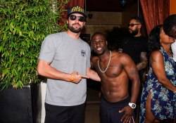 Kevin Hart joined the party with his fiancé Eniko Parrish. The comedian jumped into the DJ booth, taking control of the mic and doing a few minutes of stand up for the crowd. Colin Kaepernick of the San Francisco 49ers hit up Tao Beach, joining Hart in his cabana, and Fabolous stopped by the pool party late in the afternoon.