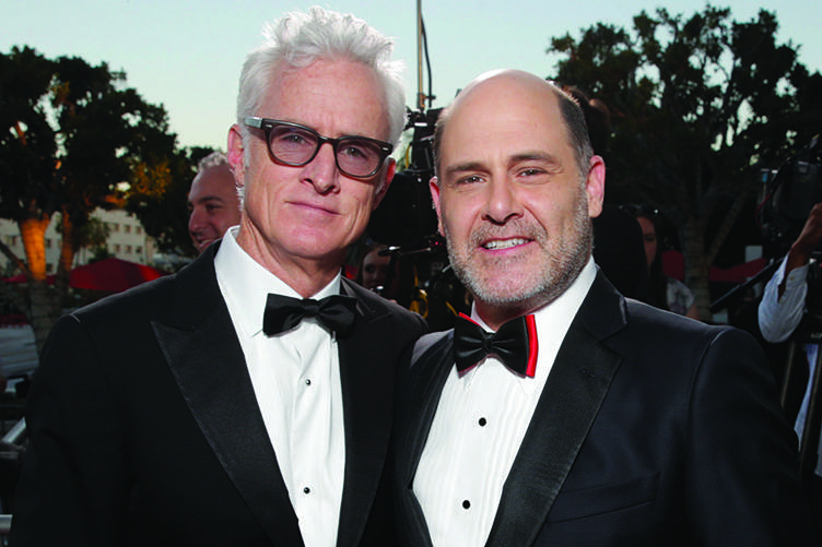 John Slattery, left, and Matthew Weiner arrive at AMC’s Black & Red Ball to celebrate the final episodes of “Mad Men” at Dorothy Chandler Pavilion on Wednesday, March 25, 2015, in Los Angeles. (Photo by Todd Williamson/Invision for AMC/AP Images)