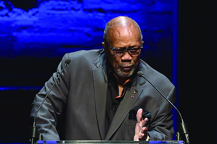 Quincy Jones presents the distinction in service award at Backstage at the Geffen on Sunday, March 22, 2015, in Los Angeles. (Photo by Jordan Strauss/Invision for Geffen Playhouse/AP Images)